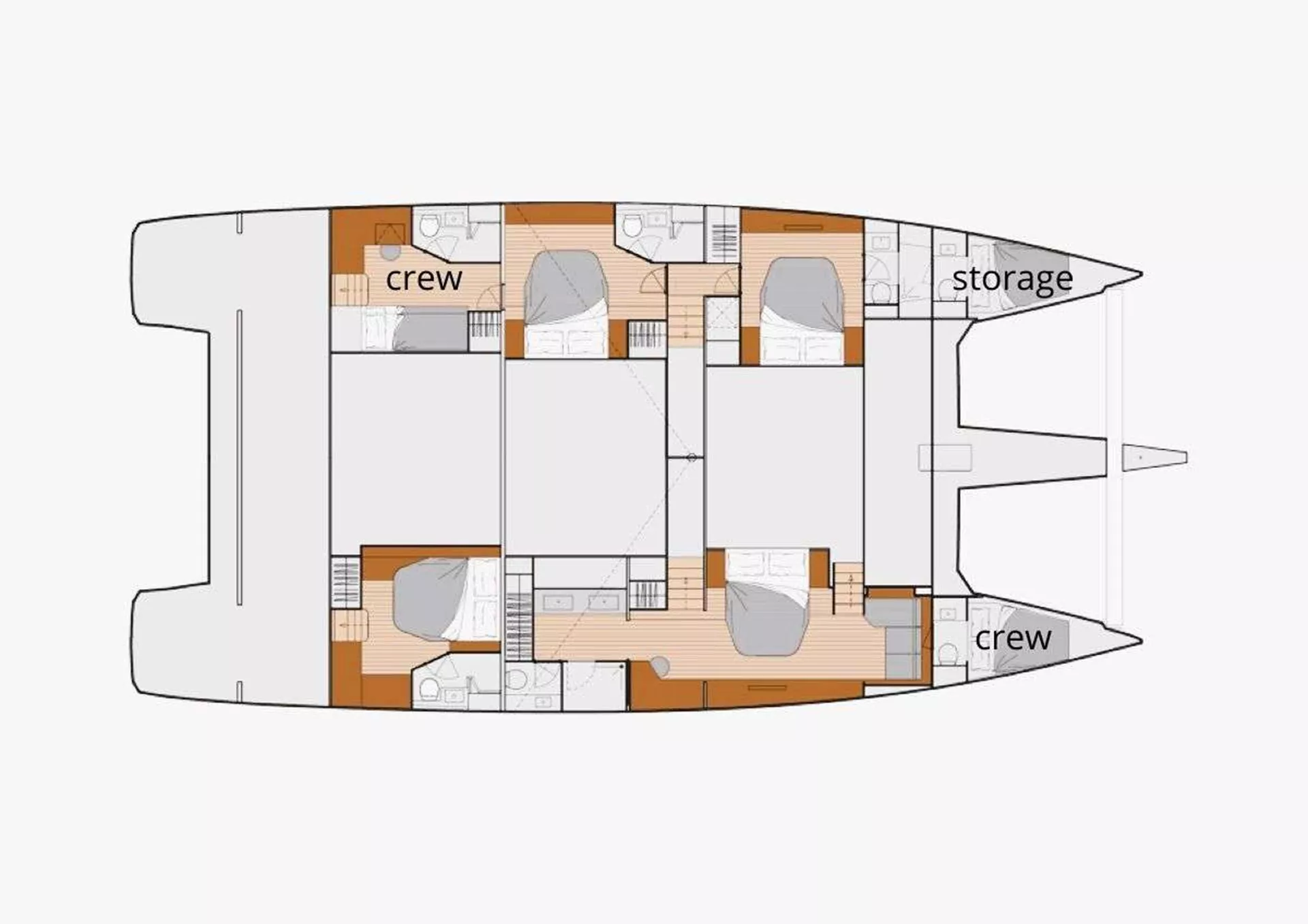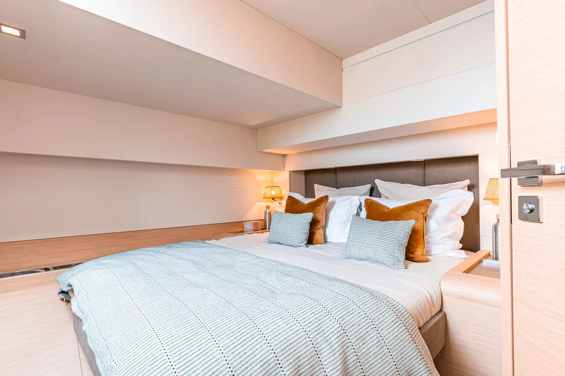 The Blue Dream accommodates 8 people in 4 double cabins, each offering a comfortable and elegant atmosphere, with private bathrooms and air conditioning with private control: the main cabin with king size bed, desk, bathroom, TV and two access points (one from the lounge and one from the forward deck), and 3 double cabins with queen beds.