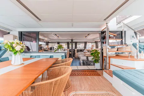 Her outdoor area with a spacious flybridge, a seawater jacuzzi on the forward deck and a rear cockpit welcoming the dining area, invites you to relax and enjoy.