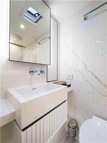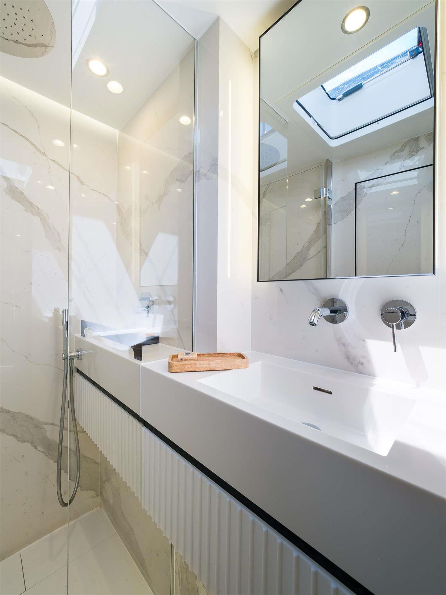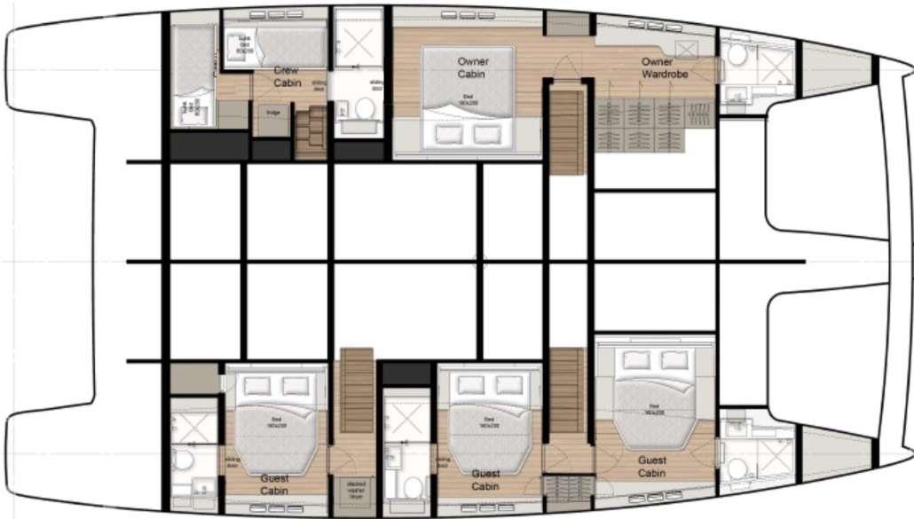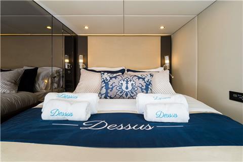 Each cabin is designed with elegance and privacy in mind, offering guests individual air conditioning controls, ample storage space, and modern amenities. The master suite is a true highlight, providing a serene retreat with a generous walk-in closet for added convenience. The remaining three guest cabins are equally well-appointed, each with its own en-suite bathroom, ensuring everyone on board enjoys a high level of comfort.
