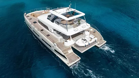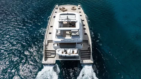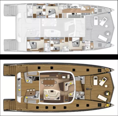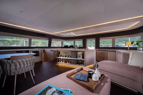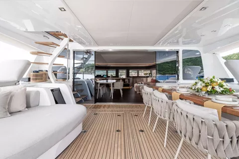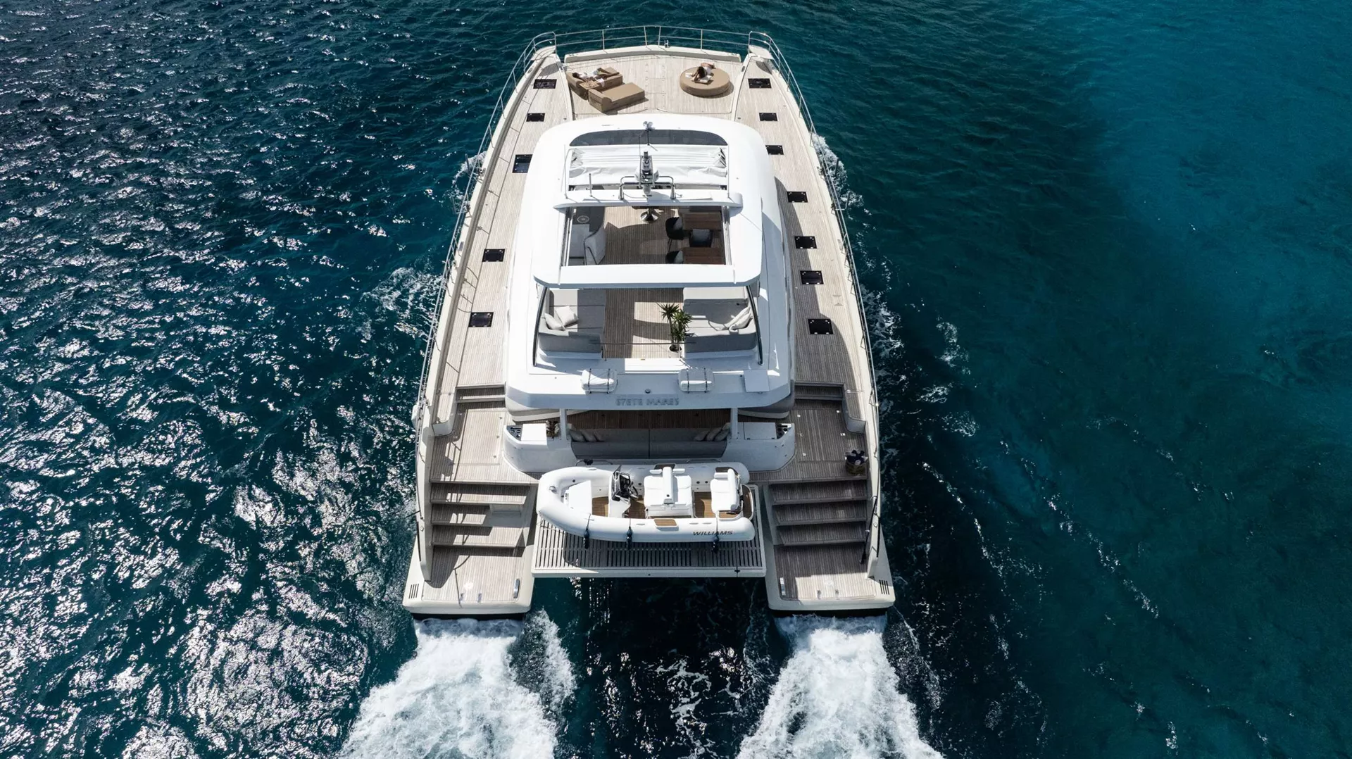 Siete Mares will accommodate 8 charter guests in 4 staterooms that offer the option for differing cabin arrangements if needed. She is a 2025 motor catamaran with a Williams 110 HP, 15 foot, 8 passenger tender, hardwood decking, hydraulic lift, state of the art water treatment system, luxury staterooms with in suite televisions and stereo systems, galley down with full wet bar in the salon, interior and exterior dining options, interior lounge with a 55 inch retractable flat screen television, exquisitely customizable menu, eco-friendly and reef safe toiletries, bar stocked to guest preference, 1 two-person kayak, water skis, wakeboard, 4 stand up paddle boards convertible to a windsurfer, 8 underwater scooters, deep sea fishing equipment, snorkeling gear, floating dock, rendezvous scuba diving, yoga mats, exercise bands, dumbbells, board and card games and Siete Mares giveaways.