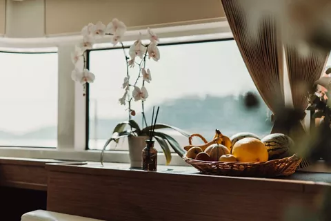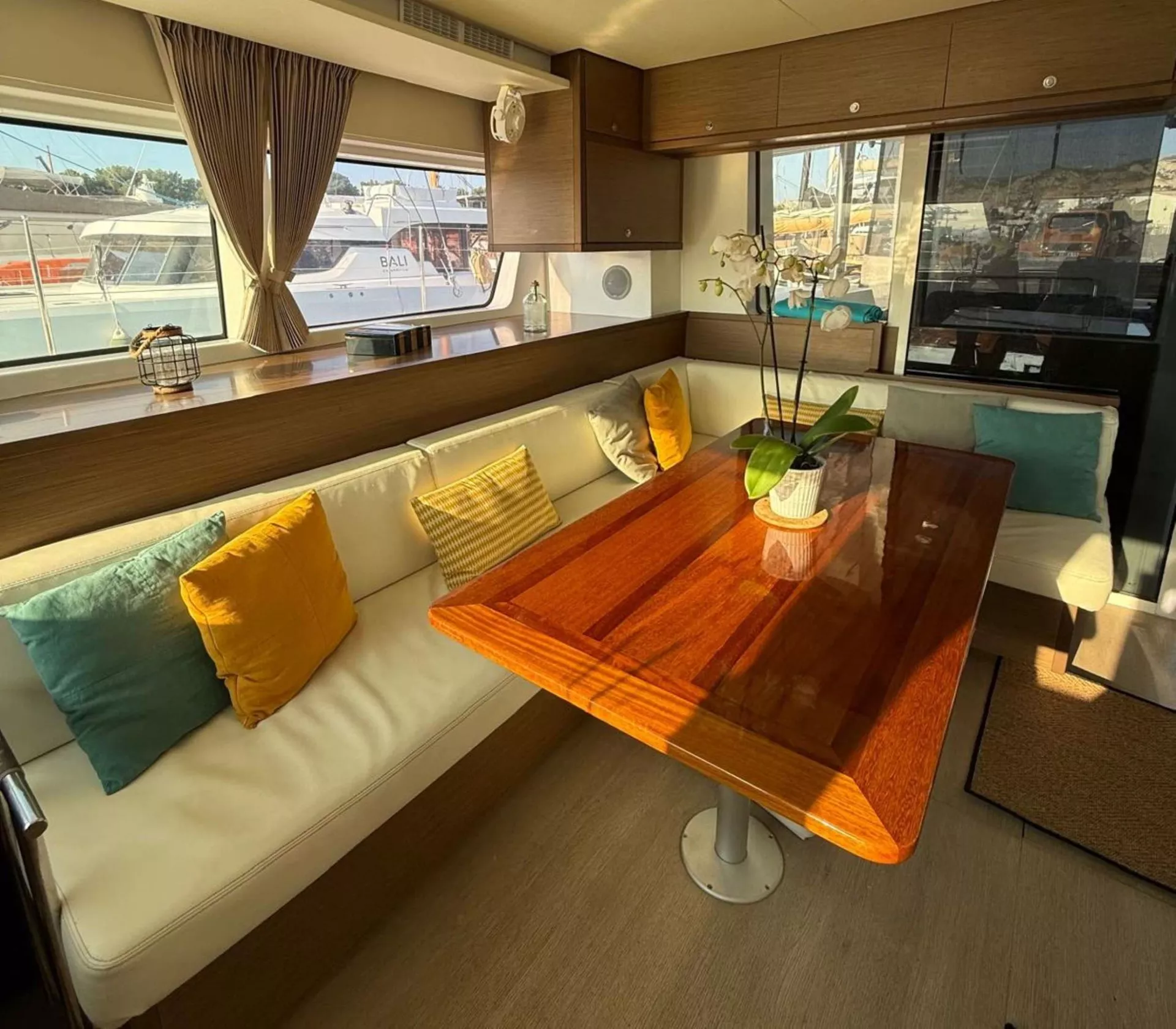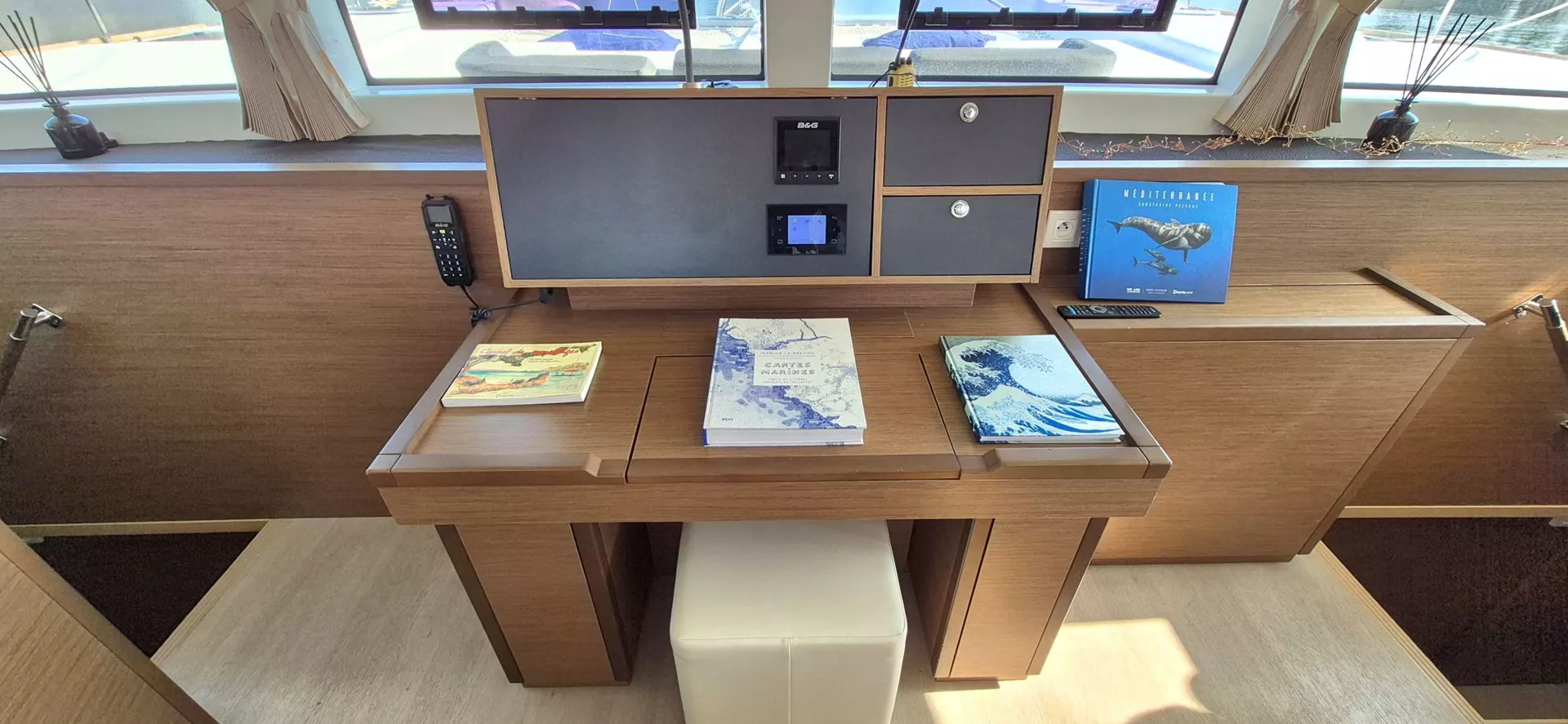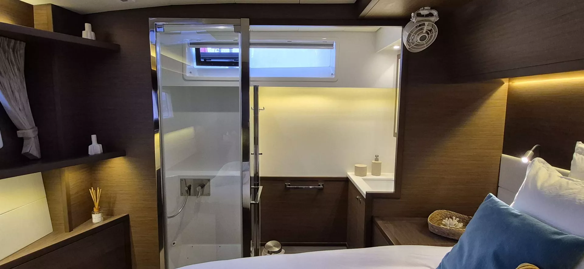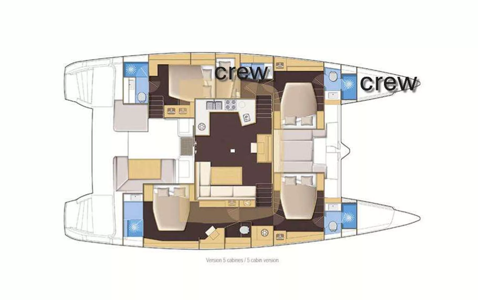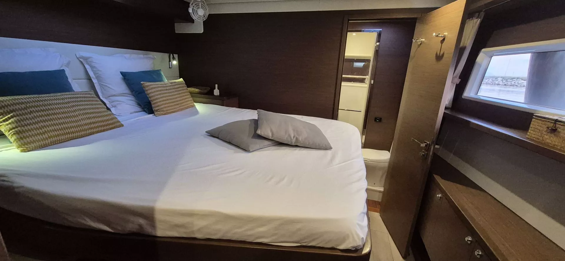 The 4 double cabins, with ensuite bathrooms, are bathedin light thanks to the large portholes along the hulls.