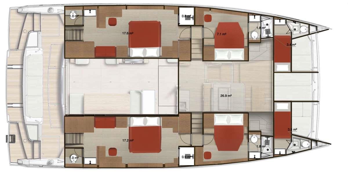 Accommodates 8 guests in 4 cabins, 2 Master with king size bed and 2 Queen size Cabins.