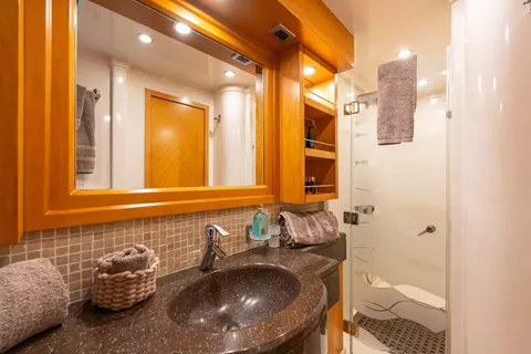 LADY B has impressive living areas. Her main salon offers ample seating on 2 sofas and lounge chairs, a convertible formal dining table can also be a games table/coffee table, a full wet bar is forward in the salon complete with seating, large windows allow plenty of natural light, while cream toned carpets and ceiling accent the beautiful deep-toned high gloss wood panels known as ‘Elegance Interior’. Separate and forward of the salon is a second salon with a sofa, small tables and a home theatre system, perfect also as an office.