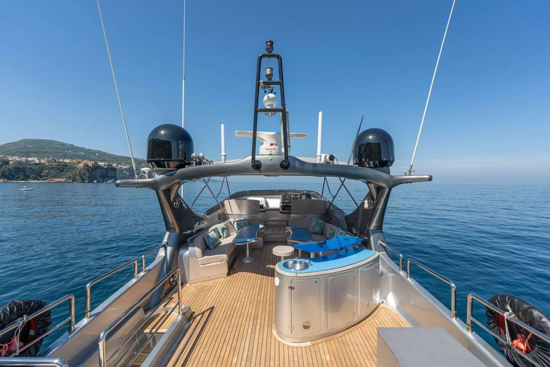The aft deck is partially shaded with the option of full shade and offers and alfresco dining table and additional seating; beyond, the extended swim platform is full beam of the yacht and accessible from either port or starboard decks. The yacht boasts also a further sunpad on her foredeck.