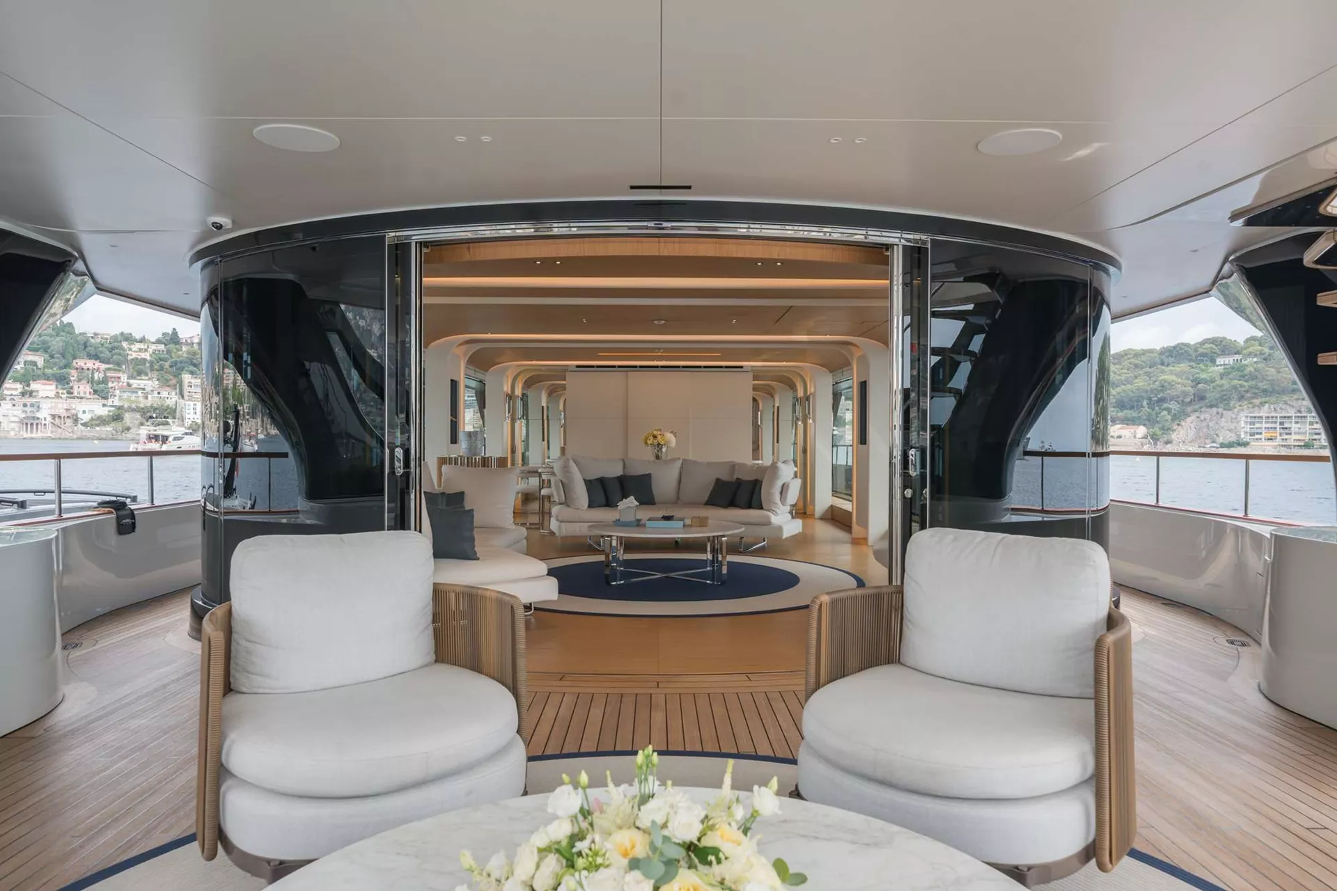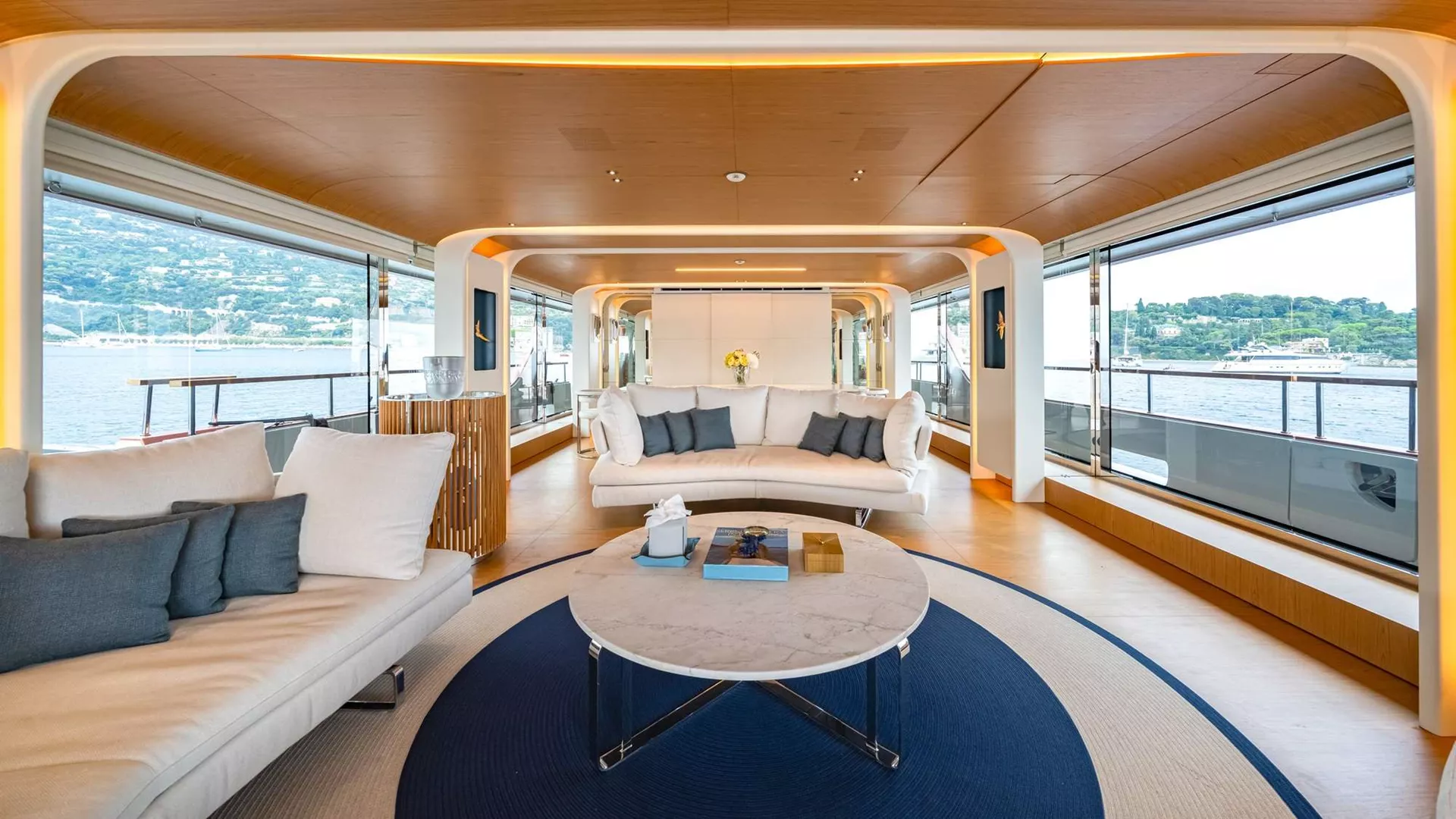 One of her many highlights is the ’cocoon-style’ observation deck that provides an intimate space to enjoy a morning coffee or evening sundowner while taking in sweeping views. The spacious Hamptons-style beach club invites guests to relax in the sun at sea-level and features a retractable fabric canopy providing ample shade when needed; as well as a platform for easy access when enjoying one of the yacht’s broad selection of water toys. Her foredeck outdoor pool lounge is yet another exterior space to soak up the sun, with plush sun pads and a large swimming pool.