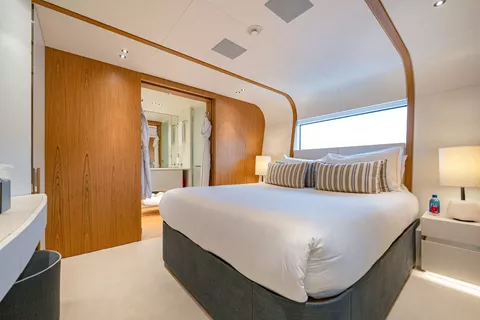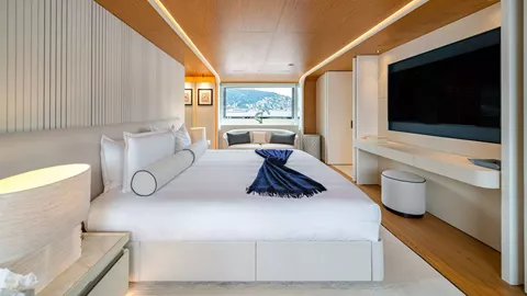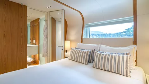 ALLURIA offers luxurious accommodation for up to 10 guests across 5 beautifully appointed suites. The layout includes a full-beam master suite located on the main deck, two VIP cabins, one convertible cabin that can be configured as a double or twin, and one dedicated twin cabin.