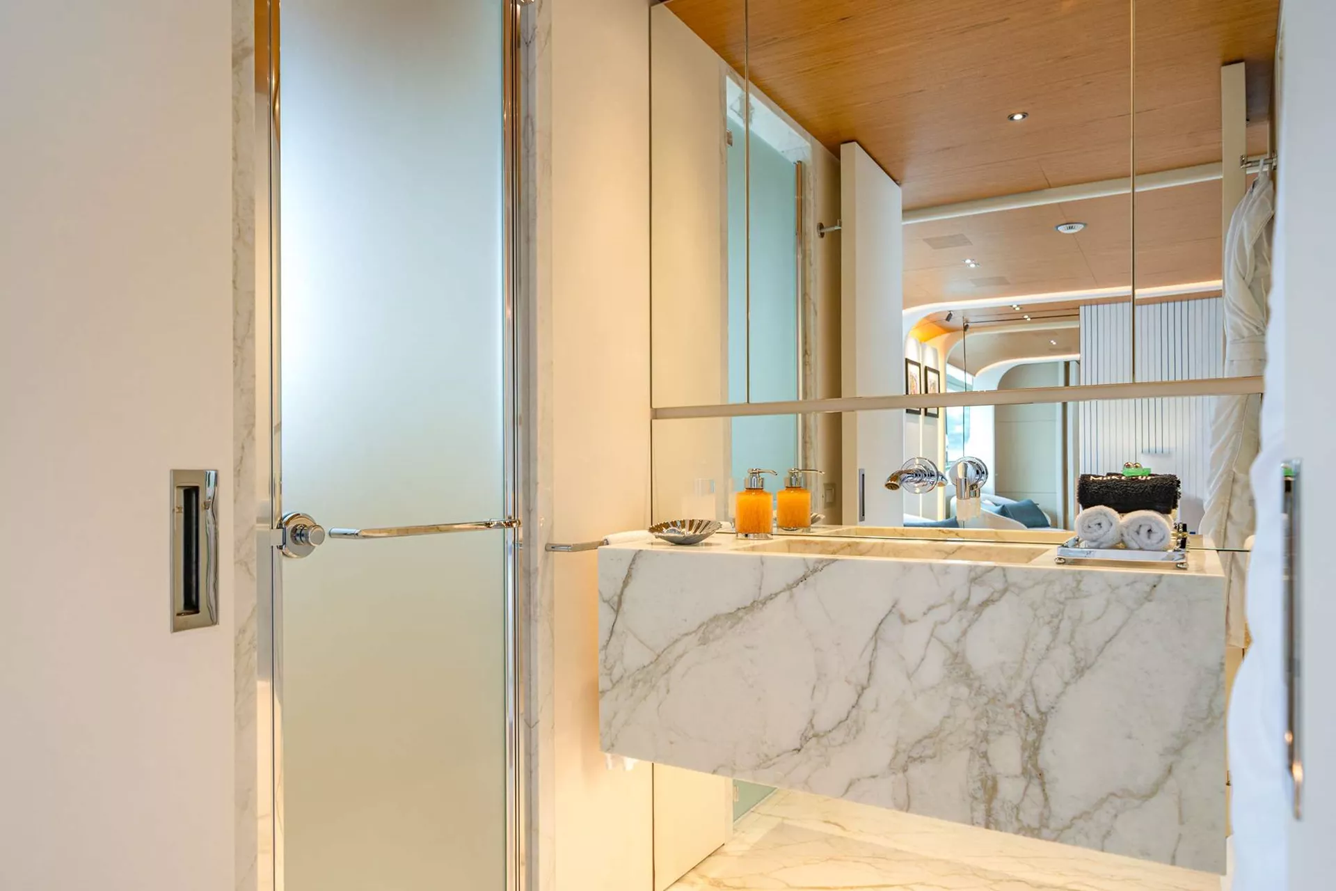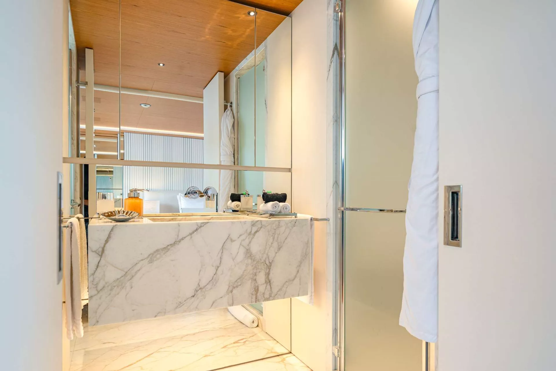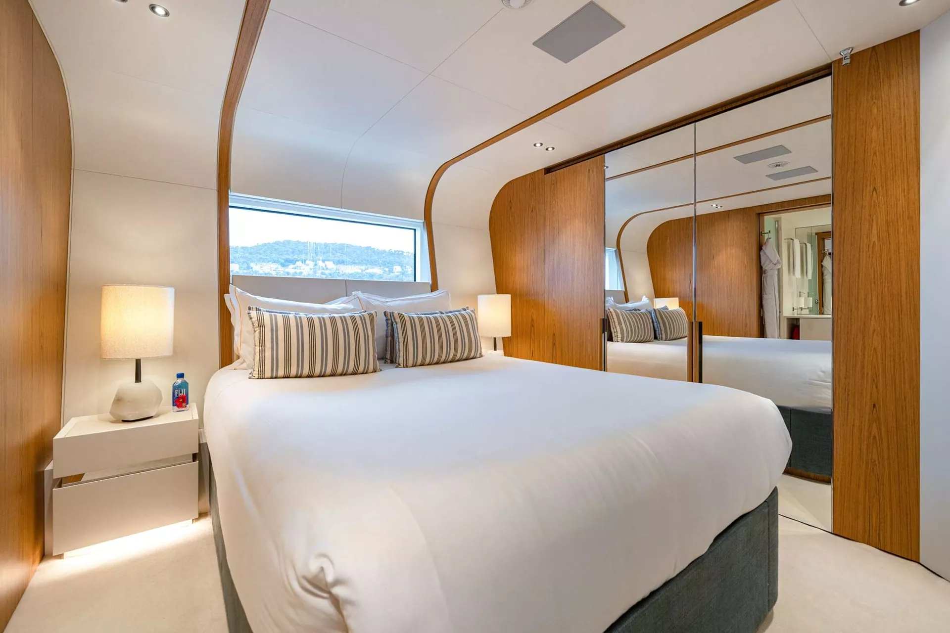 ALLURIA’s floor-to-ceiling windows, clever use of mirrors, and open-plan interior create an environment that is bright, sophisticated, and connected with the surrounding ocean. The main salon features wide-spanning windows, allowing guests to take in the incredible panoramic views even indoors, socializing on her comfortable sofa, sipping a cocktail by the cylindrical bar cabinet or enjoying a sunset dinner in her formal dining area. She provides seamless flow from the interior main salon to the main deck aft. Each of the cabins are well-appointed. The vast full-beam, on deck master suite is designed with natural light from the surrounding panoramic windows. It also features a private seating space that can be used as an office, a vanity and a generous en suite bathroom. Her four additional guest cabins are well-appointed and ideal for families, mixed groups and couples.