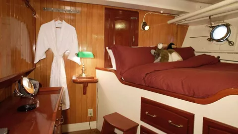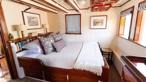 Sleeps 3. DOUBLE bed on one side. Drop down Pullman SINGLE bed on the other side. Two opening portholes. Private bathroom is across the hall, with shower.