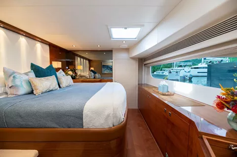 Guests are pampered from the moment they step aboard, with a choice of three exquisitely appointed suites: an on-deck California king Primary suite, a VIP king suite, and a twin berth-or-king cabin, all with en-suite bathrooms.