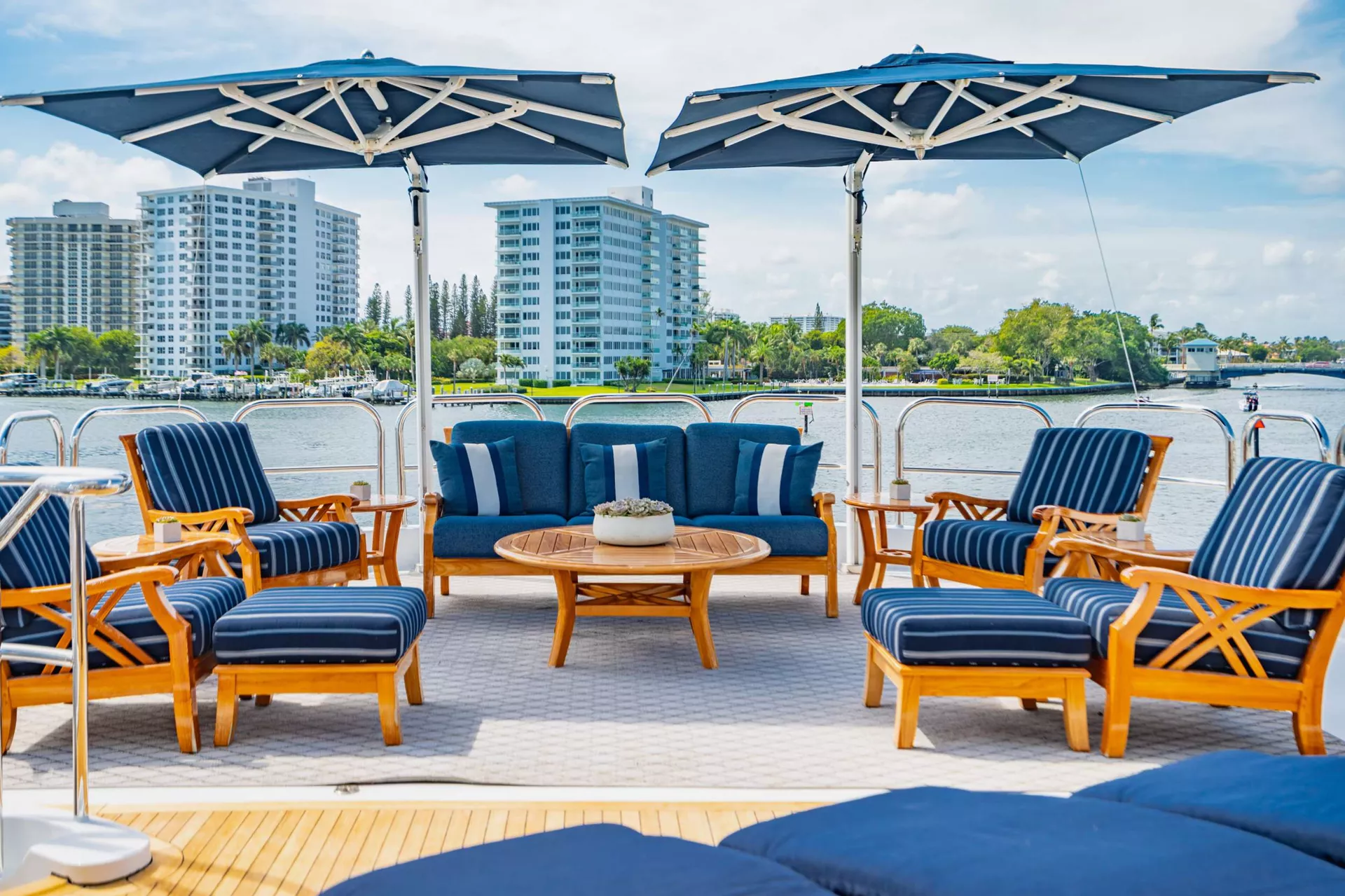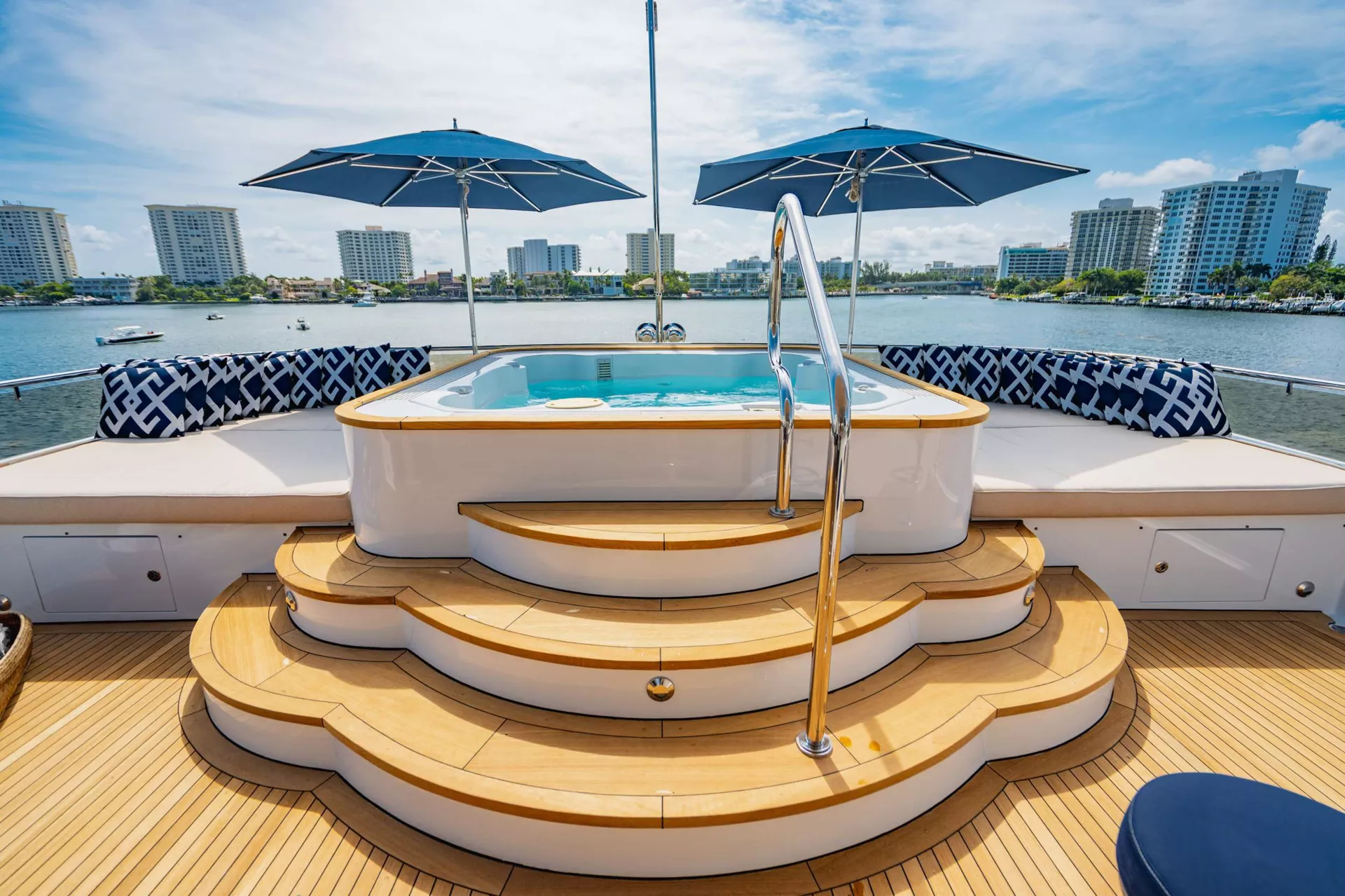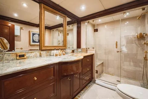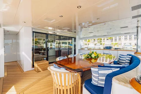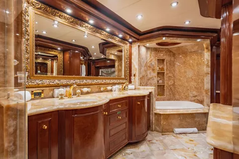 maple burl inserts throughout. She has zero speed stabilizers and a shallow draft for her size making her and excellent Bahamas and New England cruising choice. Her owner has enjoyed decades of charter yacht ownership and upon purchase; they completed an extensive refit to ready her for charter. The complete interior was updated as well as exterior improvements, additions, and many audio-visual upgrades. The flybridge was designed and reconfigured specifically for charter guest’s enjoyment. There is a beautiful Jacuzzi area as well as sun beds, full bar and entertainment as well as aft lounging area with umbrellas for shade and total relaxation. Below the flybridge on the sky lounge deck there is a massive round table for dining and comfortable furniture aft for lounging. The sky lounge is a comfortable and happy space and offers a game table, the perfect spot for movie watching and full bar. The main salon features formal dining forward and aft salon area that includes an entertainment system. Aft of the salon is a spacious deck area with dining option and access to the expansive swim platform. Underway the 2 wave runners are stored here and once at anchor they are in the water along with an extensive list of other toys and ready to go for guest’s enjoyment.