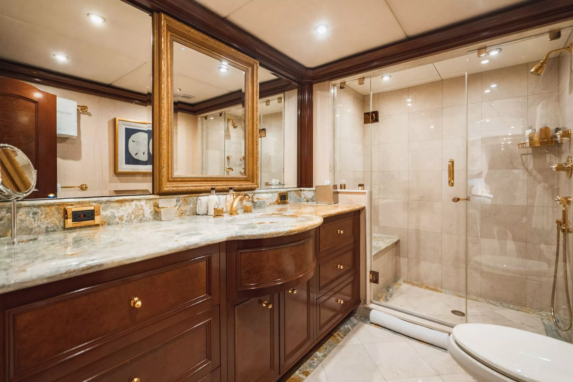 AQUASITION accommodates up to 10 guests in 5 staterooms. The on-deck, full beam Master stateroom boasts a king size bed, an office and large his and hers en suite bathroom. Below deck are 4 additional staterooms; 3 with king size beds and 1 with twin beds.
