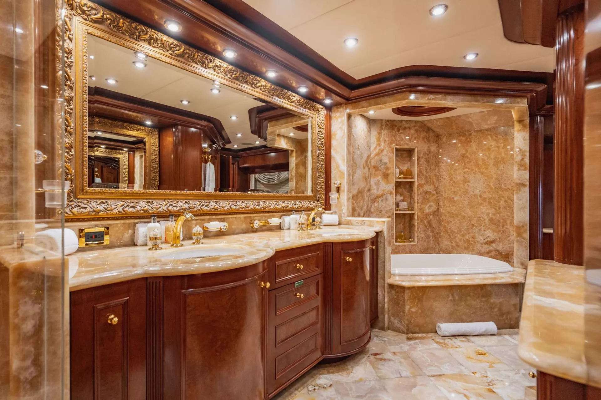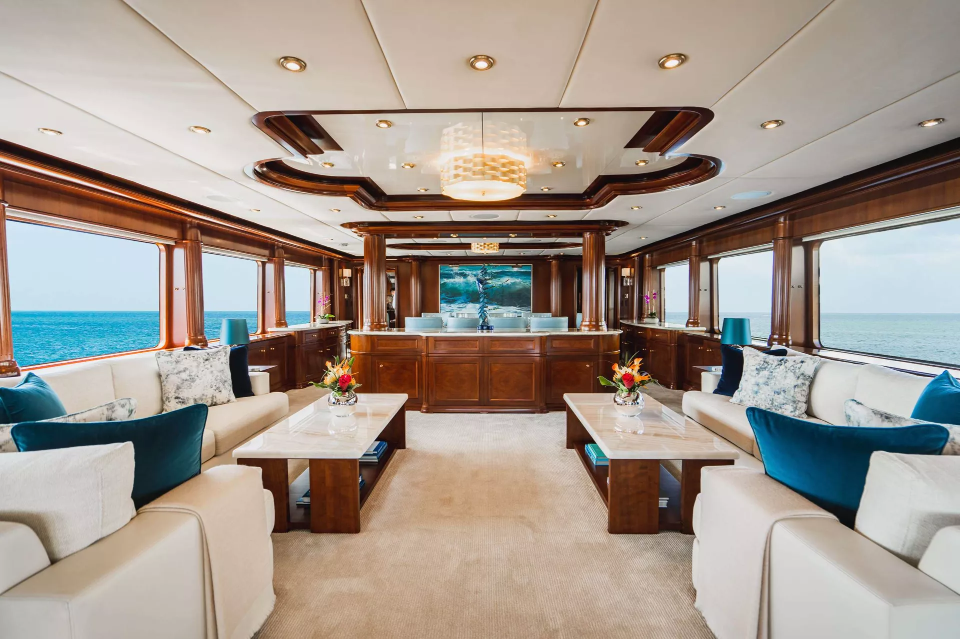 Aquasition, a 142’ Trinity yacht whose spectacular interior features cherry wood joinery with