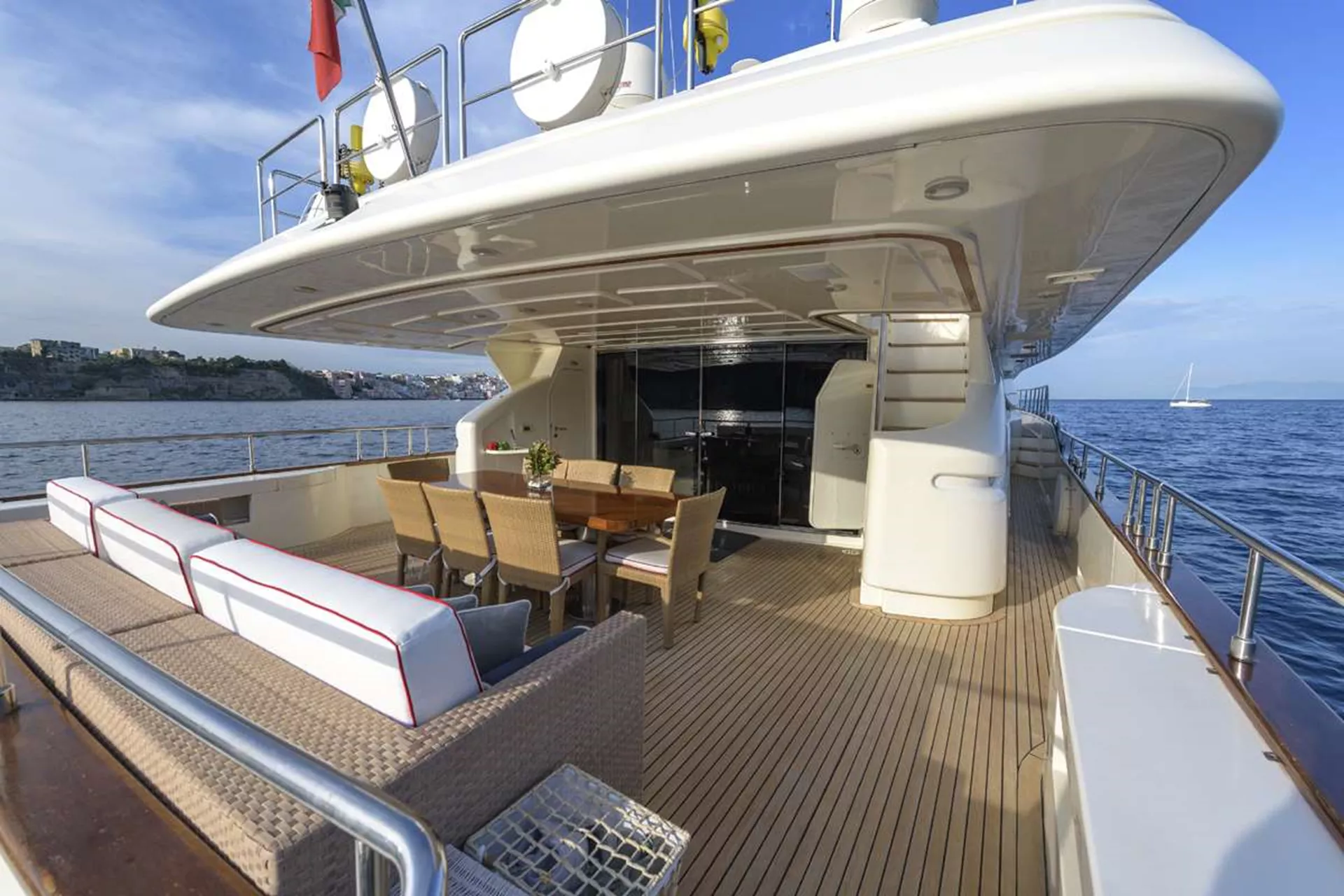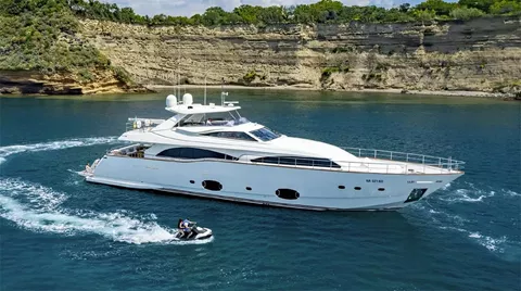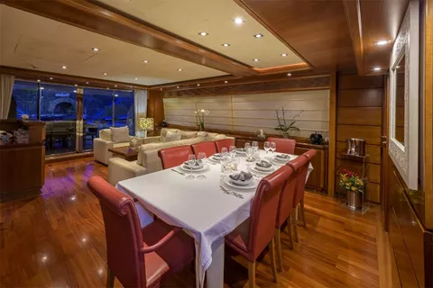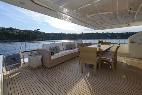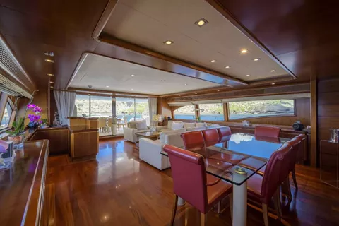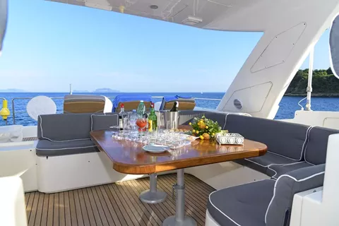Launched in 2008 by Italian shipbuilder Ferretti group, motor yacht ANNE MARIE features elegant interiors, spacious deck areas, salon and dining designed as an open space. A cozy lounge featuring sofa, coffee table and entertainment system is aft. Forward is a formal dining table seating up to 9 guests.