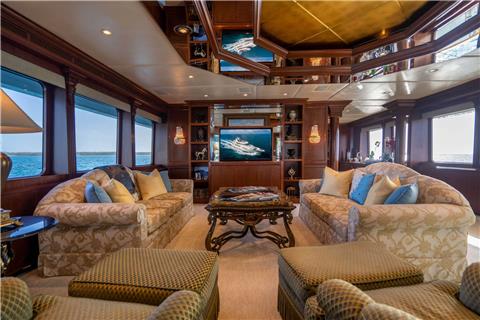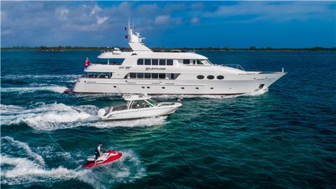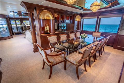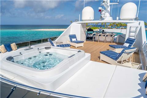 Elegance meets power with this solid and artfully constructed 145′ Trinity Yacht. After chartering her for five years, the current owners purchased Relentless in late 2018 and have enjoyed upgrading and refitting her. Come relax in the impeccable craftsmanship of her exquisitely designed, soft beige and gold-accented interiors. Opulent dining, spacious interiors, and panoramic views will take your breath away… pampering awaits. Her main salon includes a sit-down bar aft, salon area with entertainment and a separate private formal dining room where the chef’s culinary creations are waiting to delight. Relentless features five lavish staterooms including a king master suite located on deck with his and hers bathroom to include a large shower and Jacuzzi tub. Four additional guest staterooms are located below, which include two king staterooms, one queen and one twin, all with en-suite bathrooms, full entertainment systems and large closets for storage. The sky lounge offers a comfortable gathering area to watch movies, enjoy afternoon treats from the chef and is a popular guest area. Step outside to experience our three spacious decks and submerge yourself in 360 degrees of breathtaking vistas. All decks feature ample seating, tables and chairs for socializing and dining. The spacious sky lounge deck features a large round table where many theme parties are held. The crew of Relentless have a huge assortment of fun filled themes from fun to formal and anything in between. If you’re feeling invigorated, Relentless offers a treadmill and full assortment of gym equipment for outdoor exercise on the newly refit flybridge. The flybridge was reconfigured with a new Jacuzzi, wraparound sun beds, lounging furniture and new sit-down bar as well as a movie night option under the stars. Relentless offers a full list of water toys for your fun and adventure and has a proven charter crew of 9.