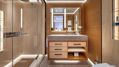The Royal Hakvoort living spaces were designed with entertaining in mind. Formal dining areas are featured throughout the yacht. The galley is an open, socially-oriented space, that is also properly adapted for the onboard chef. A glass elevator reaches all decks onboard, transporting guests to any of the 5 decks. The dedicated owner's deck features a private dining area and a foredeck jacuzzi for privacy and relaxation. The large king bed is surrounded by 180-degree floor-to-ceiling windows allowing sunlight to illuminate the suite. Additional guest rooms offer convertible spaces to fit any combination of families, friends, or corporate charters. Each stateroom features large windows, providing a stunning view from every angle. One stateroom is wheelchair accessible. TOP FIVE II is also equipped with Starlink Maritime.