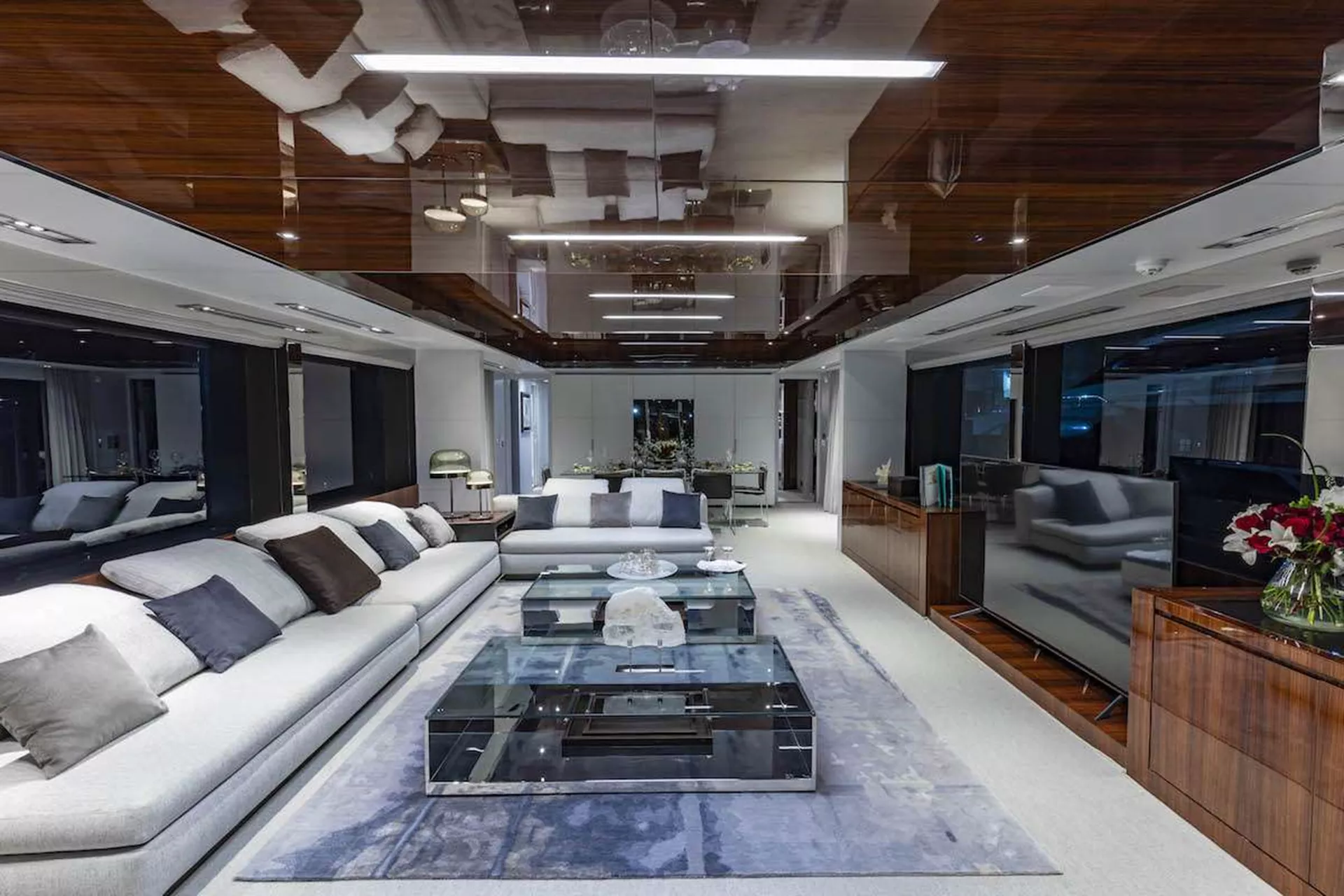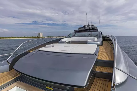 NO SURRENDER is a 110'’ Riva Dolcevita model that offers an extremely quiet, fast and comfortable cruise with a distinctly modern but opulent style. Riva's choice in finishings is well executed; striped tropical rosewood, Patrona Frau leather, crystal, and chrome accents add a luxurious level of detail to the interior where it's normally overlooked. On the exterior, a metallic shark gray and black carbon fiber complement her sleek, svelte design.