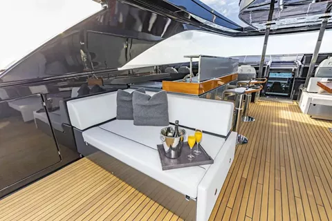 The expansive sundeck provides a great area for entertainment, offering lounge spaces and a wet bar. Alfresco dining is found on both the main deck aft and the covered flybridge. Another great feature on this vessel is the hideaway jacuzzi located on the bow which can be closed away from sight and used as a seating area, or opened up for use to truly enjoy la dolce vita!