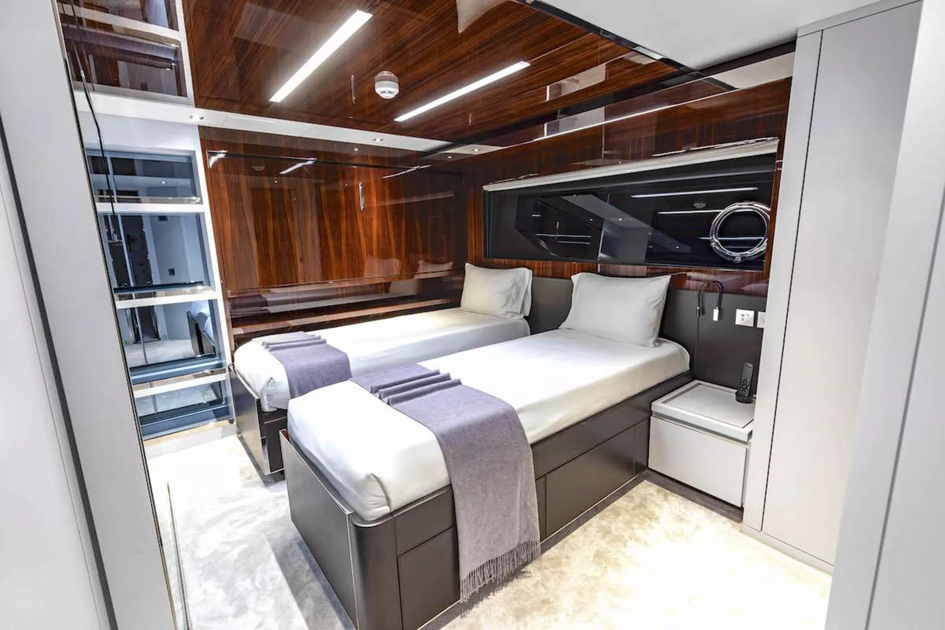 Accommodation is for 11 guests in 5 staterooms, all are finished in dark rosewood and neutral white tones. Luxurious white carpeting throughout.