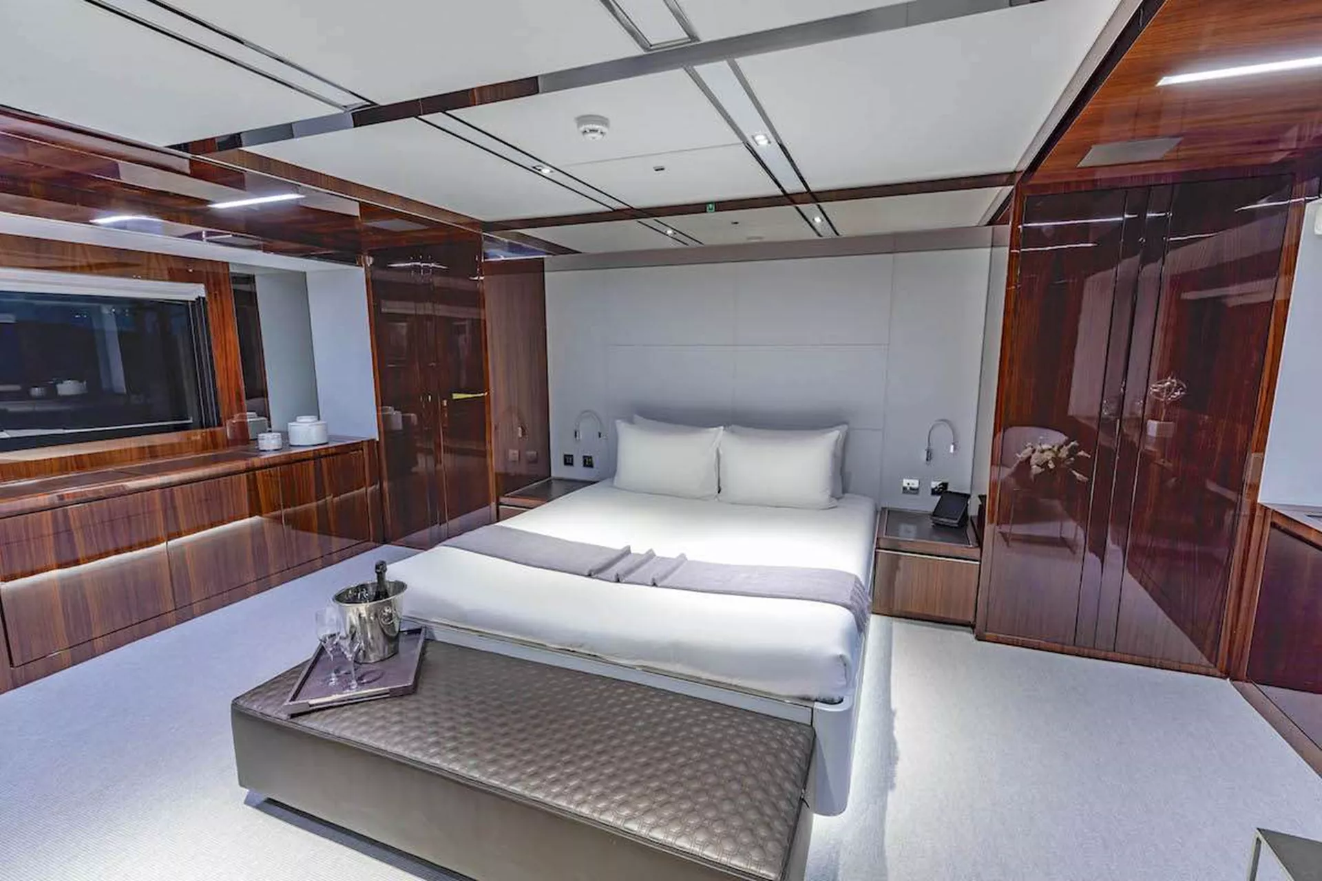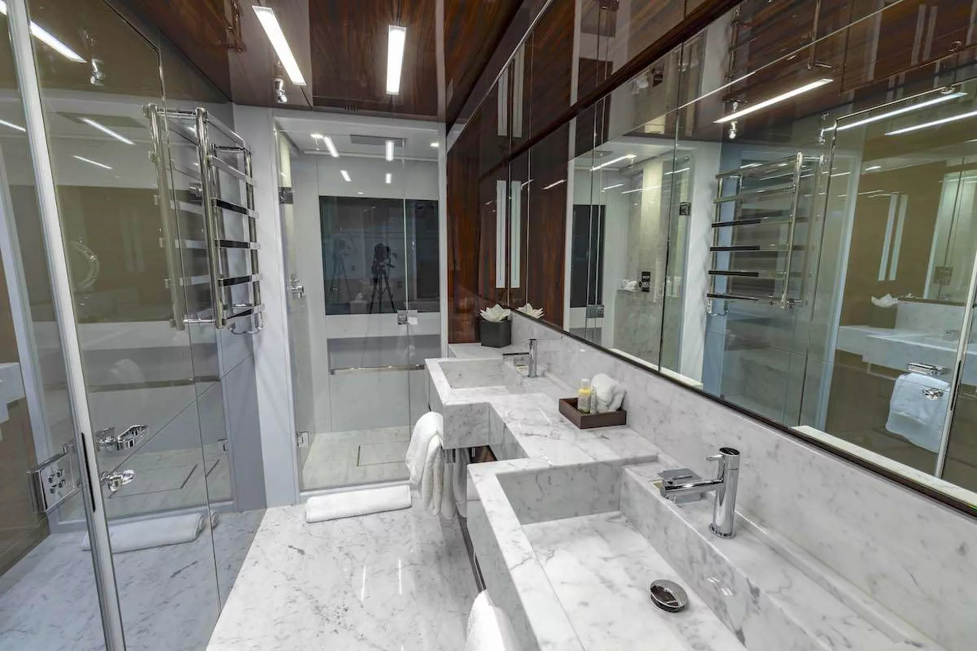 The Full-beam Master Suite is located on the main deck with King size bed (facing forward). Two walk-in cedar-lined closets. Sizeable 49" Apple TV and mini-iPad for A/V control. Vanity and ample storage. Master bathroom countertops and floors are finished in Carrara marble; large glass doors separate a large walk-in shower, and premium features include a mirrored glass wall and towel heater.
