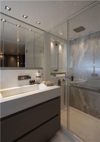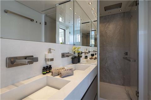 Master suite located on the main deck, with king size bed facing the panoramic window and ensuite facilities.