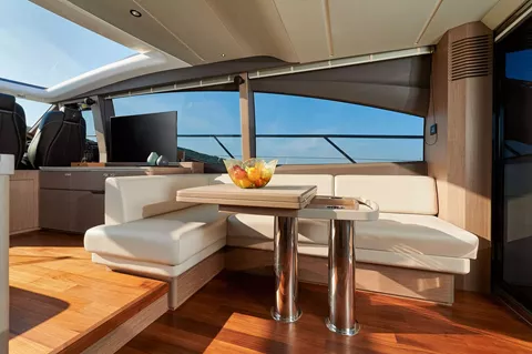 Her spacious cockpit inspires relaxation with a sun pad at the back and an al fresco dining table for socializing.
