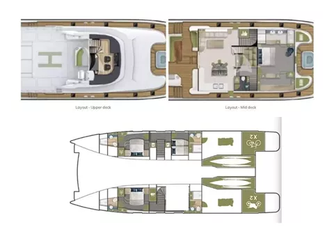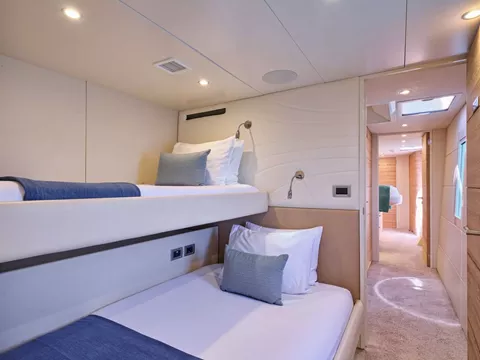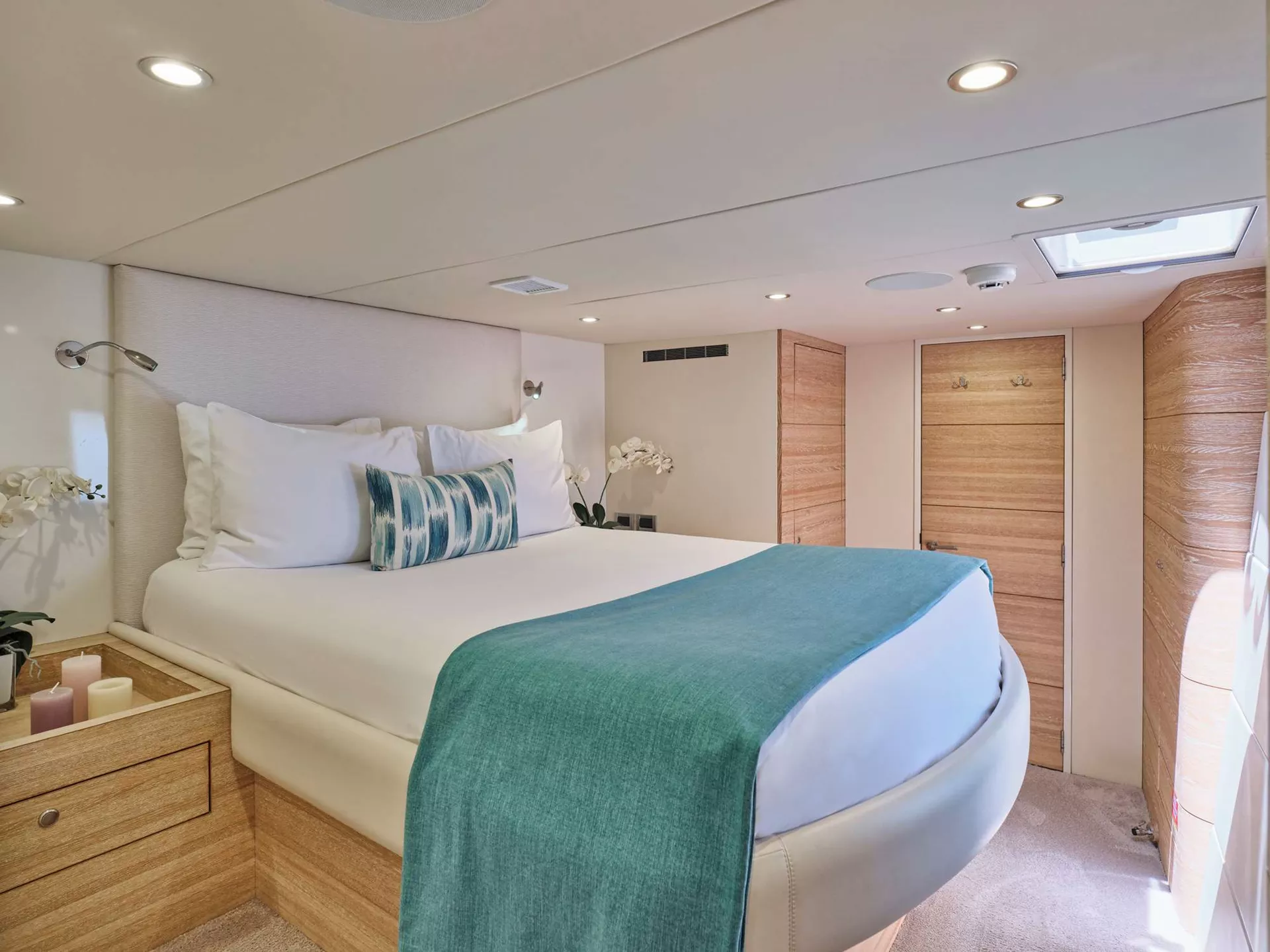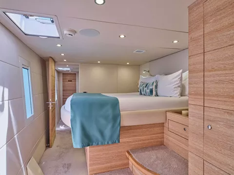 Master on main deck with direct access to outdoor Jacuzzi, two Queen staterooms, each en suite with spacious showers, toilet and ample storage in two closets and cabinetry. Aft in the starboard hull 2-3 more guests can find accommodation in a double bed with pullman bunk, also with en suite facilities.