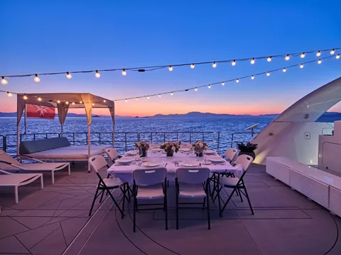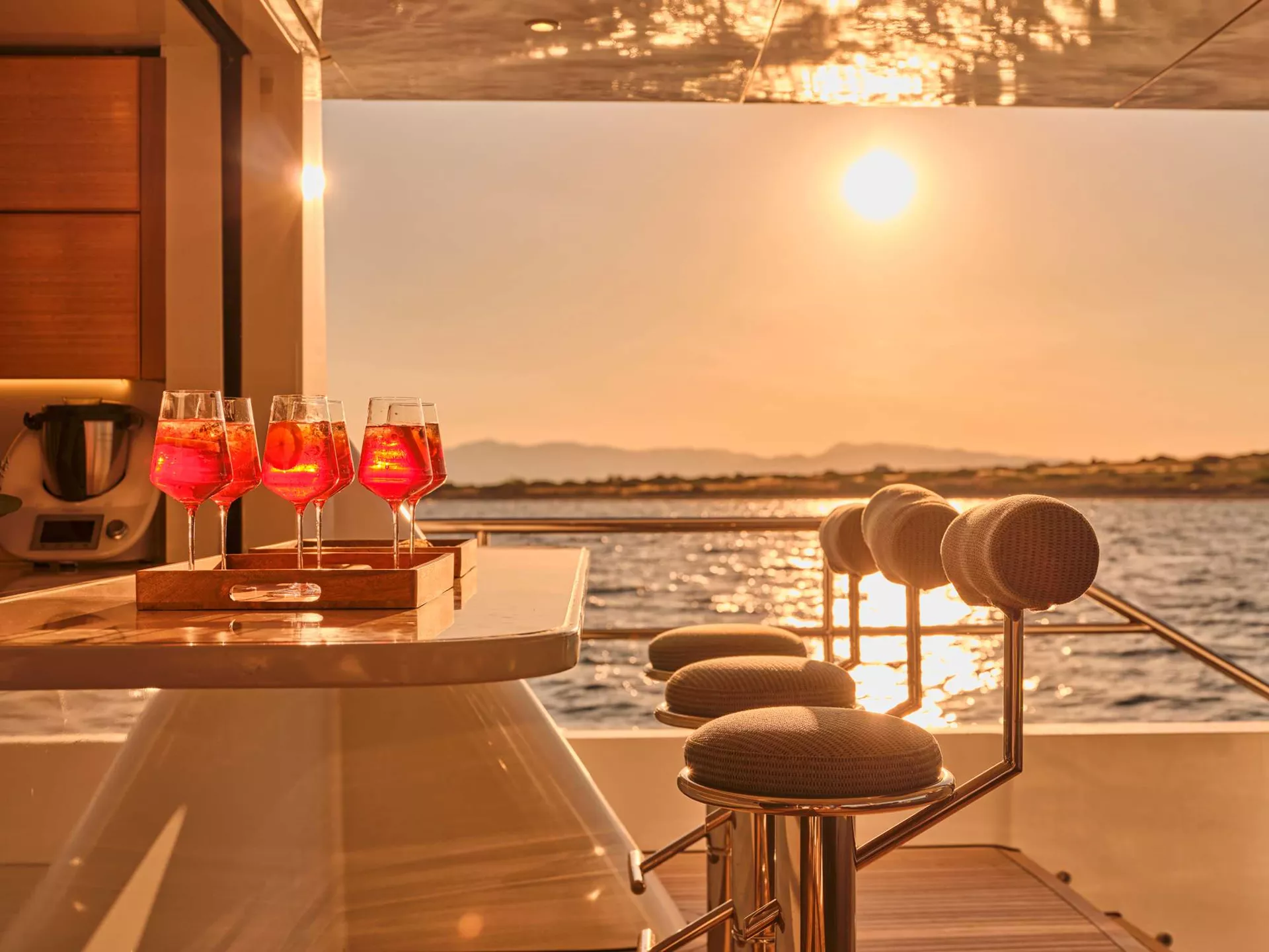 Moving up to the SUN DECK during the day is akin to stepping into a private garden in an exclusive villa. Two custom cabanas easily offer comfort to 3 adults each with shade as desired overhead and around. A ‘jump seat’ sunpad situated in front of the helm on this level also provides the best view from above. As the moon rises, this deck transforms to a whole new experience of its own. Whether experiencing movie night with the oversized cinema in position and popcorn machine or an elegant dinner under the stars, this is the most favored space aboard by most.