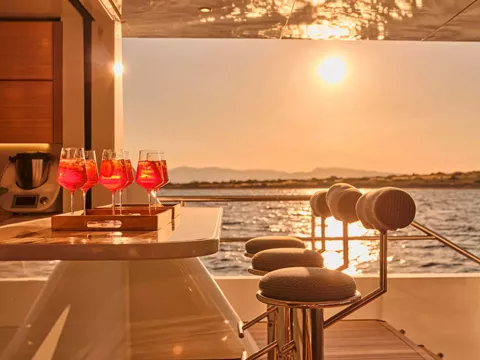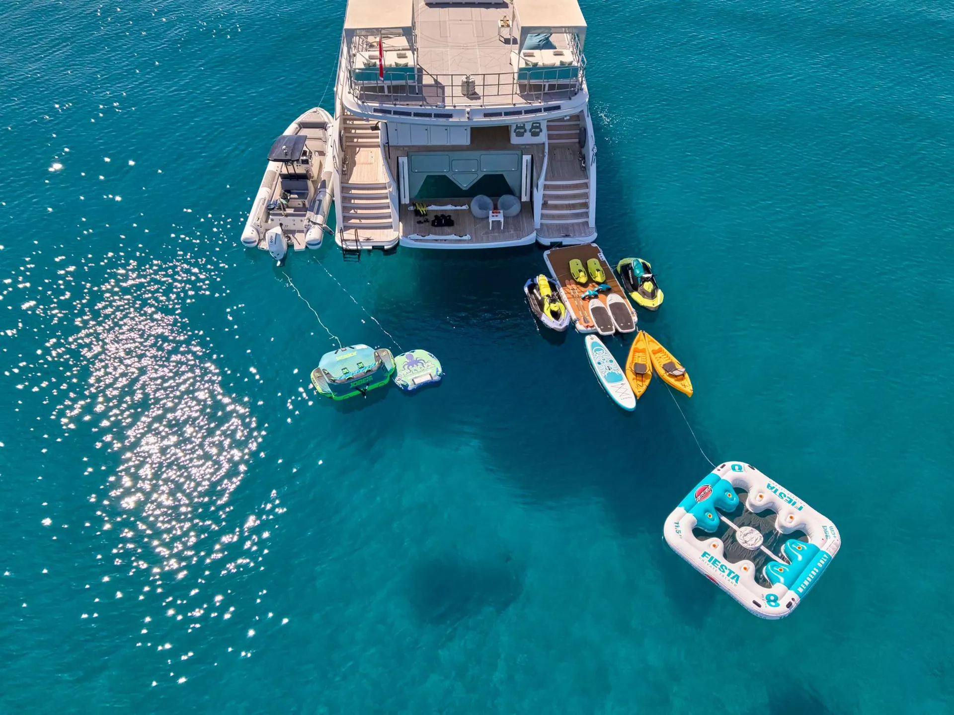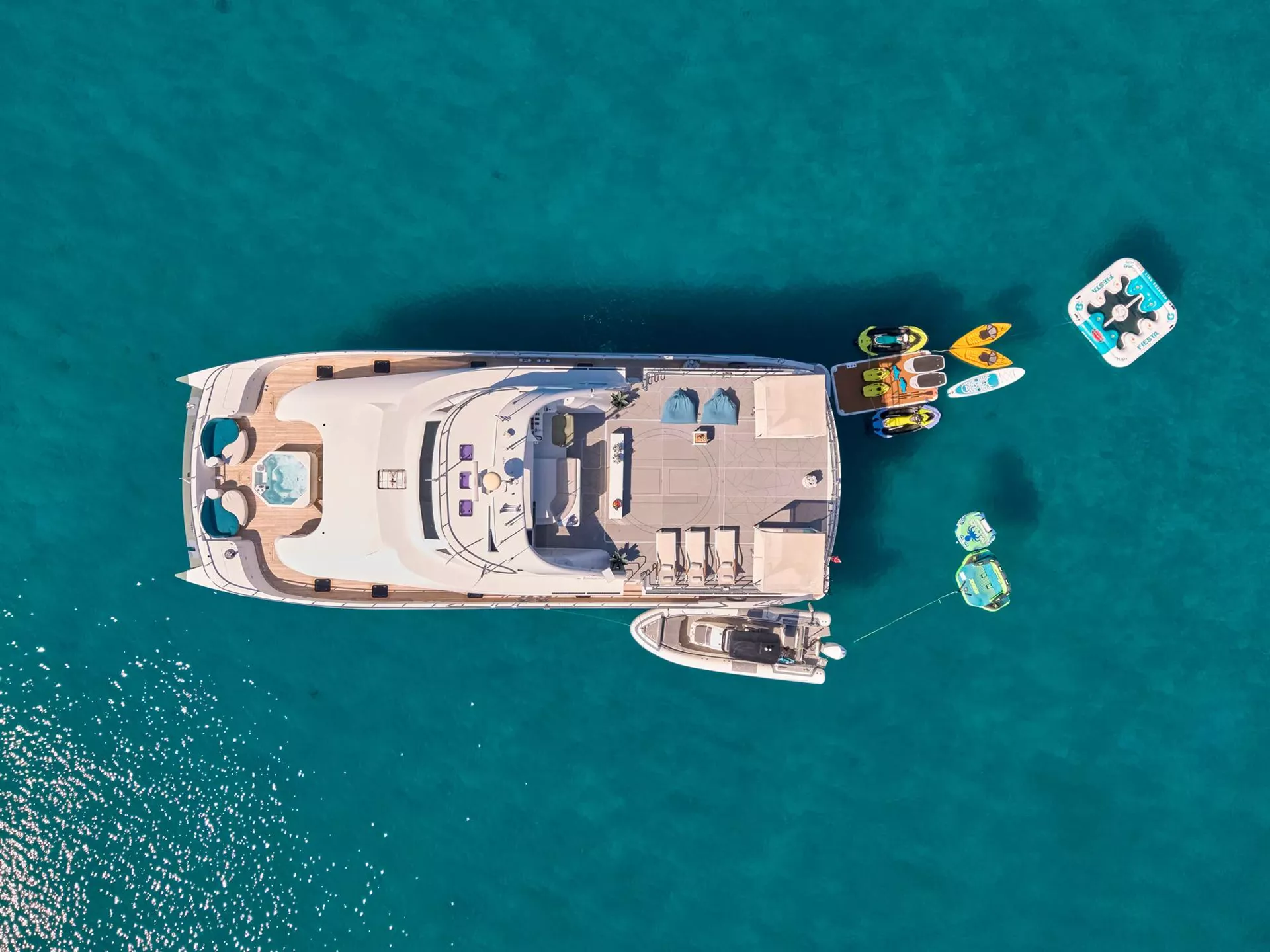 Not to forget the area where the most action occurs, the SWIM PLATFORM. A hydraulic center stage secures the wave runners when under way and once lowered, this level is the easy access deck for a variety of water activities such as diving, enjoying water toys, boarding the tender, and swim entry. Transform this area with chairs and inflatable cushions for the perfect BEACH CLUB. Each hull also offers a set of steps and a swim ladder for water access.