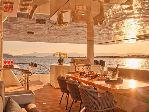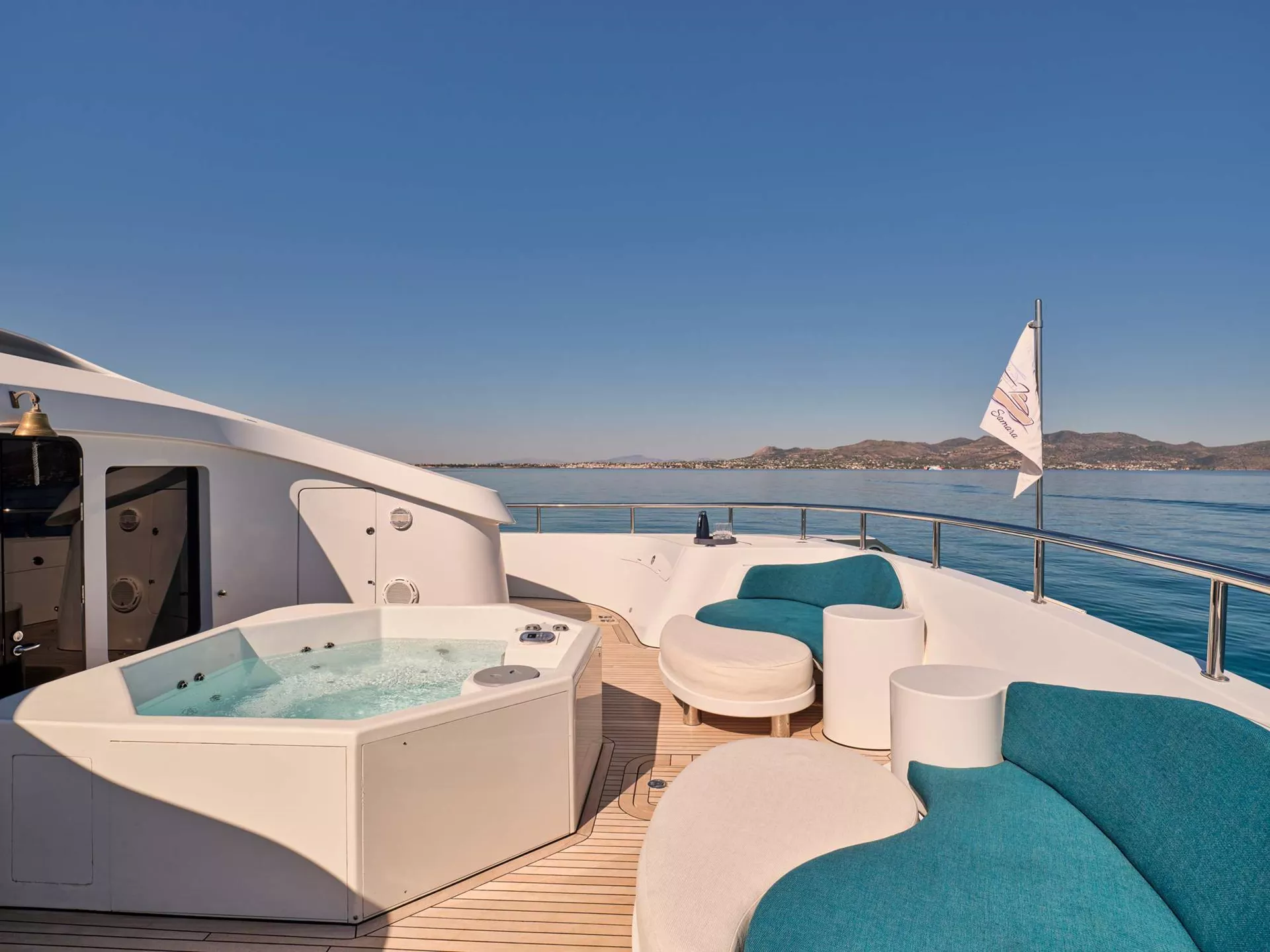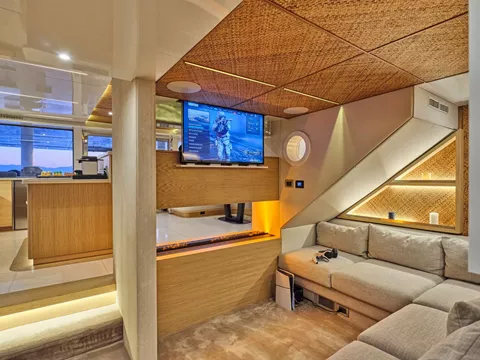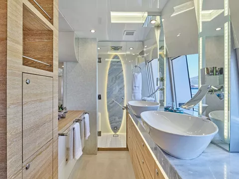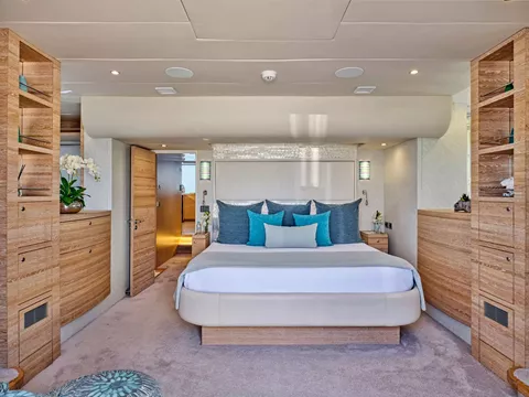 A true sanctuary on the main deck is the forward facing MASTER suite with open plan from port to starboard bringing in the gorgeous views and natural light of outdoors, inside as well. To port is the ensuite Master bathroom with double sinks featuring designer waterfall taps, private toilet and stall shower. To starboard is a walk-in wardrobe with drawers and hanging closet. Storage is ample throughout. A private glass door leads forward onto the Jacuzzi deck serving as a full Owner's deck and offers privacy with the subtle wrap around of superstructure design on both sides. Large petal-shaped loungers invited guests to relax in the sun or curl up and read a book in privacy.