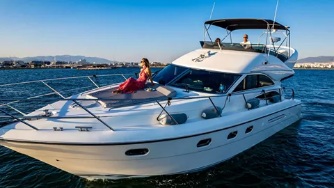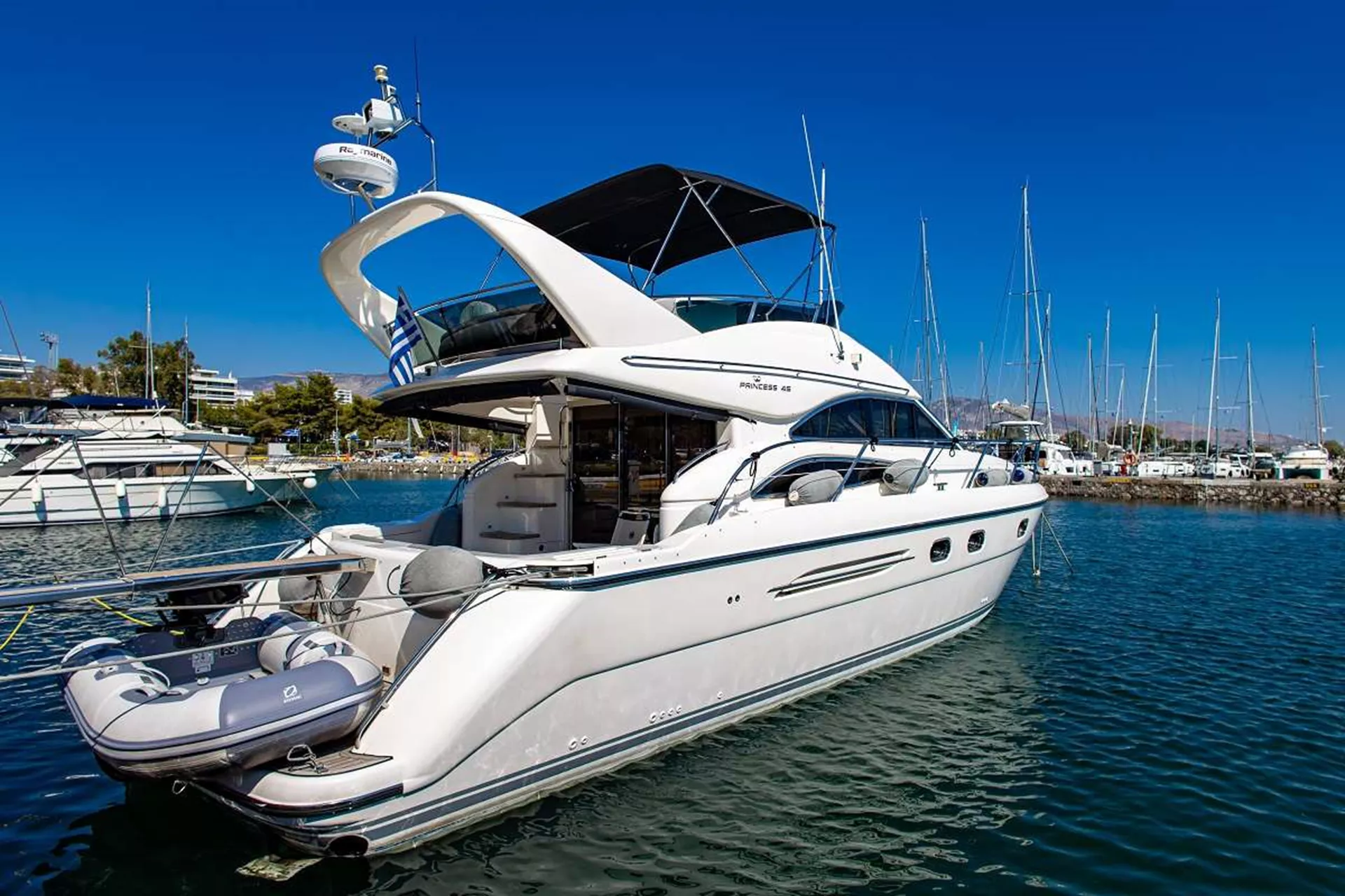 M/Y CARINA is a beautiful and top quality Princess 45 Flybridge yacht with large accommodation area for up to 4 guests for overnight in 1 master cabin and one twin cabin convertible to double on request.