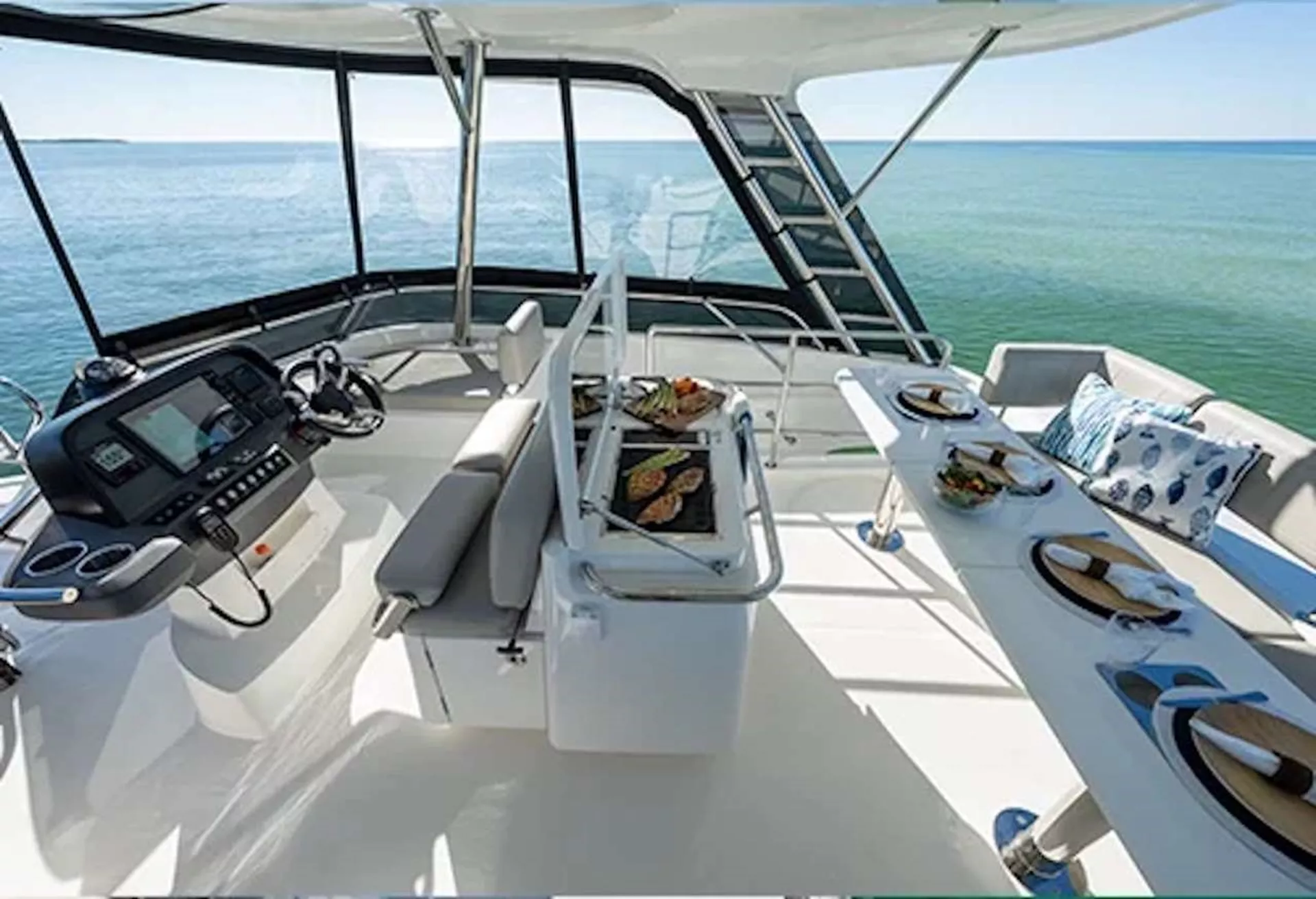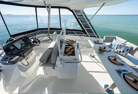 Designed by the famous VLPN yacht design, the Aquila 42Y is a modern power catamaran with soft, clean lines that combine quality and noblesse. Outside, there is a big bridge with a large table for eight people, an external BBQ, a fridge, and a comfy soft bed.