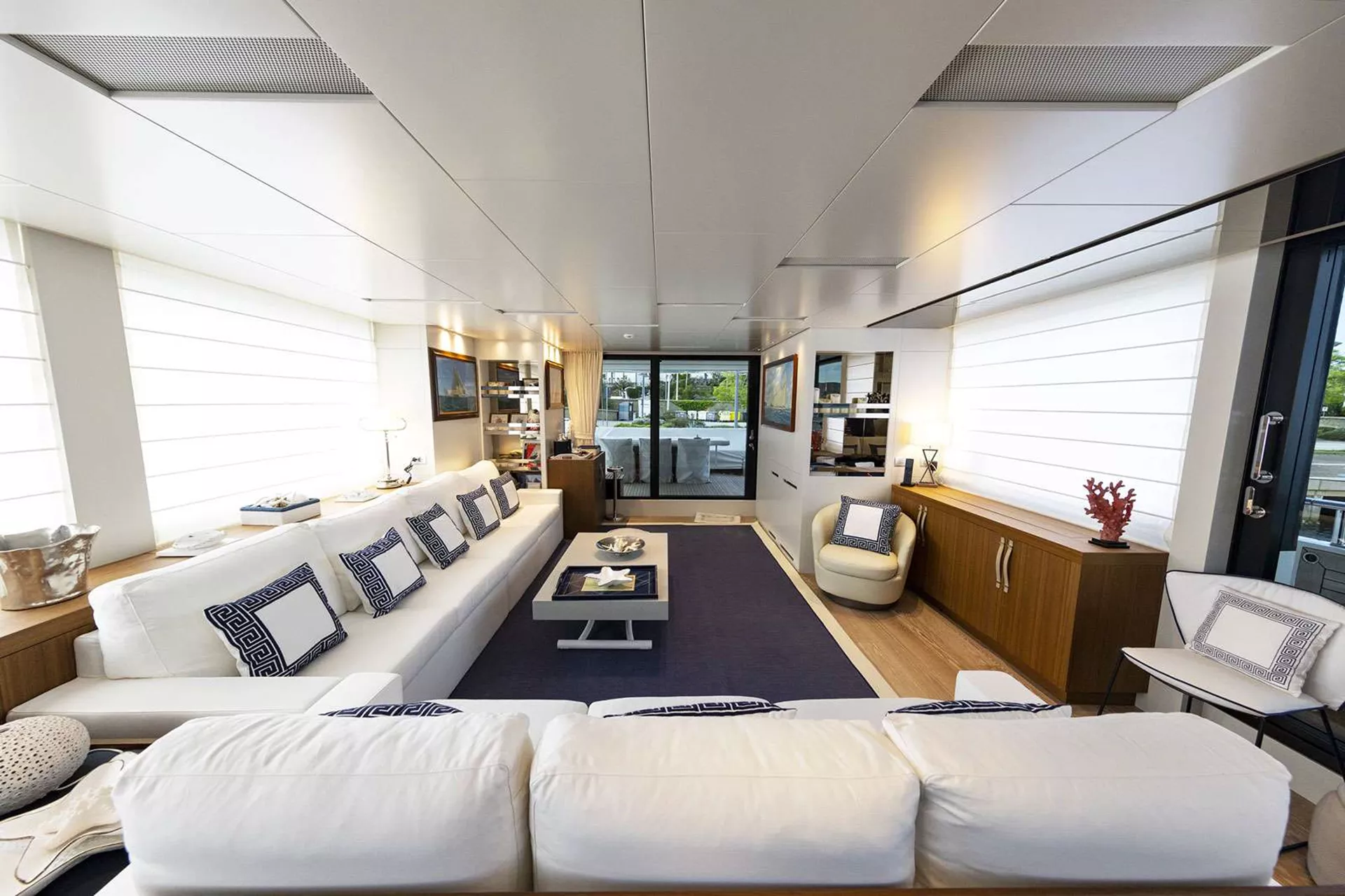 The Owner suite on the main deck, three double cabins and a twin cabin on the lower deck. All cabins are ensuite.