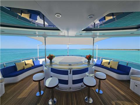 Forward of the wheel house is a delightful seating area with cushions and table. Shade is optional with a removable awning. From this area there is access to the bow or to the aft bridge deck that includes shade, a full bar, 32" TV, alfresco dining for 10 guests and additional built in casual seating and tables. The sky lounge includes a plush white sectional sofa, coffee table, 2 occasional chairs, entertainment center with 93" TV, a game table and chairs and powder room. The ceiling is accented with exposed mahogany beams. A day head is also on this level.