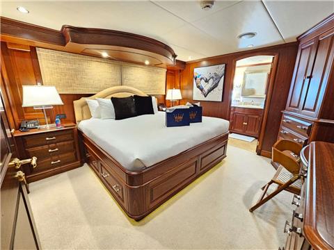 Main Deck Master Suite - King bed. The full beam master suite is accessible from the foyer through double, beveled glass doors to the master office with mahogany desk, office equipment and 20" TV. The adjoining stateroom has a Mahogany bed and cabinets, and two ensuite bathrooms. The bathrooms have sky-lights and Honey Onxy marble floors. His bathroom has a shower with Honey Onxy walls and glass enclosure while her bath has a hot tub w/jets, makeup area and ottoman. There are large windows, two walk-in dressing rooms and an entertainment center with a 30' TV.