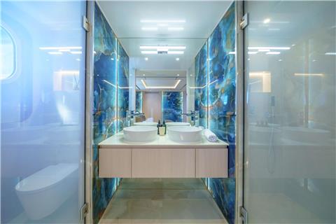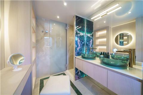 Master Cabin: 34sm2. King bed (2m x 2m). Ensuite features a separate toilet area, walk in shower, double sinks and a makeup table.