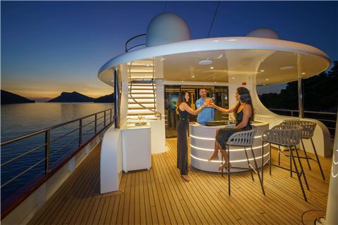 Cabins are equipped with Satellite TV, Safes, individually controlled air-conditioning, Music Systems with bluetooth and USB connectivity, robes and slippers.
