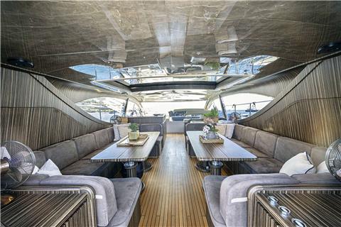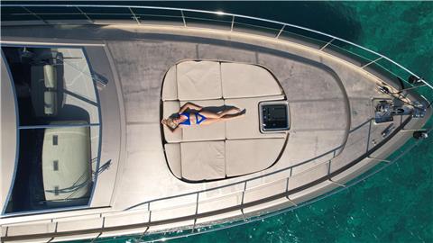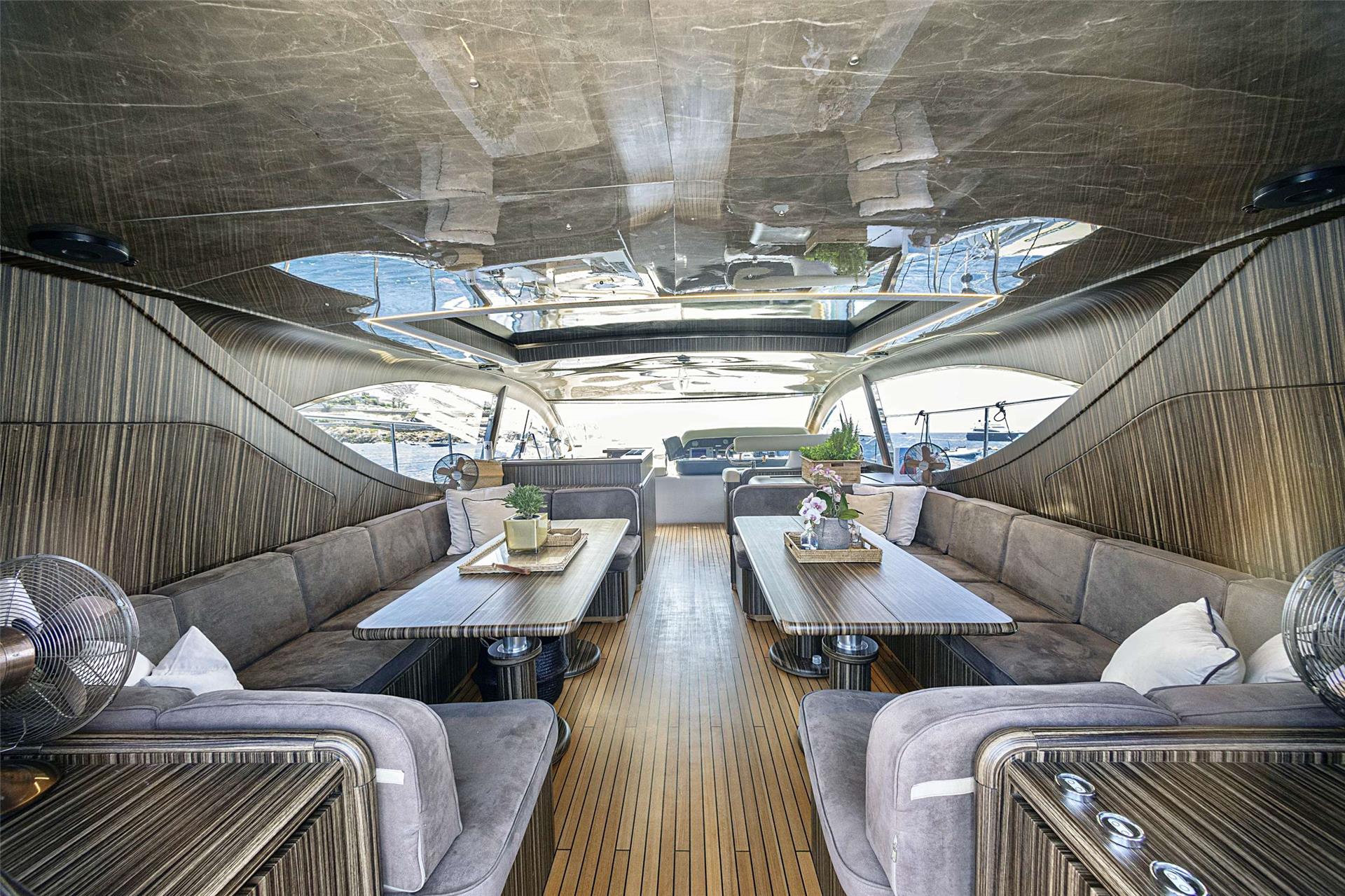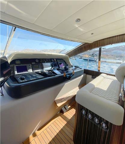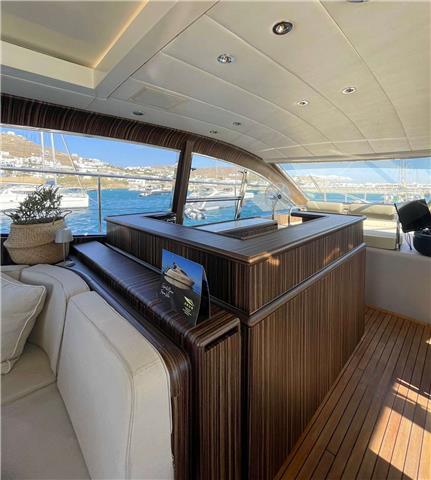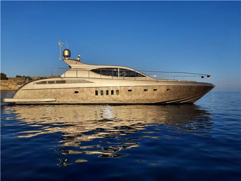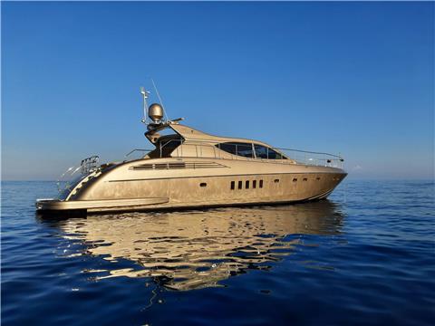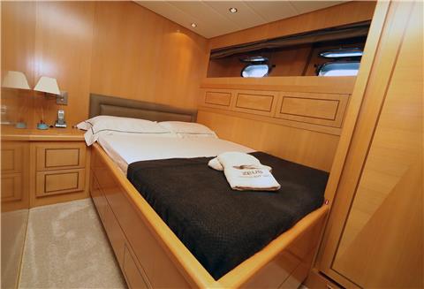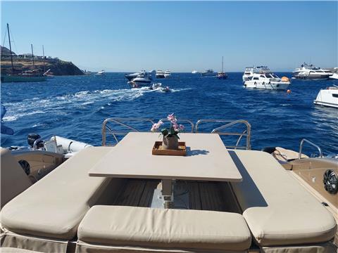 The Arno Leopard 24m “ZEUS” is a stunning motor yacht that combines sleek, dynamic design with exceptional performance and clever use of space. Designed for those who love open-boating, her main deck features a spacious L-shaped seating area around a large foldable teak table, complemented by a wet bar with an electric barbeque. The cockpit seamlessly connects to the salon through a drop-down sliding door and an opening window aft of the galley, creating a versatile living space. Additionally, the main deck boasts a wide sunbed aft of the cockpit and extra seating and sunbathing areas on the foredeck. With a peak speed of 34 knots, “ZEUS” offers a thrilling V Class sports yacht experience.