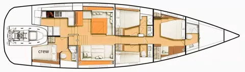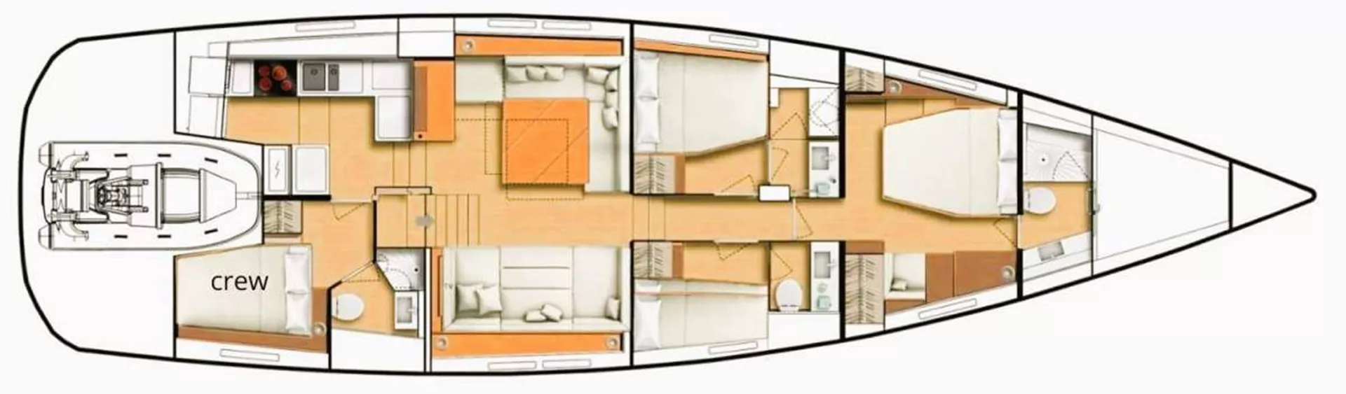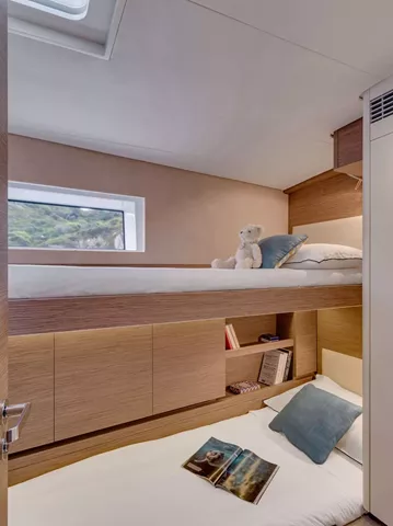 Mahina can accommode up to 6 guests in 3 en-suite cabins: 1 master cabin with Queen bed, 1 double cabin and 1 twin cabin. The Master cabin is placed forward. Behind to the port of the master cabin is the double cabin. The twin cabin is opposite.