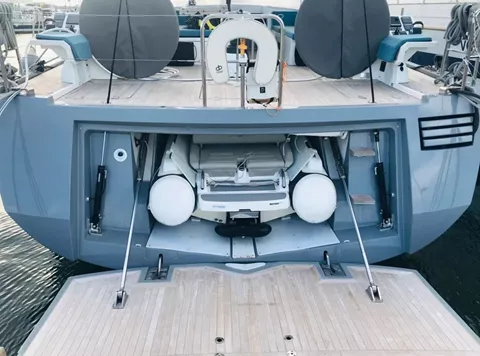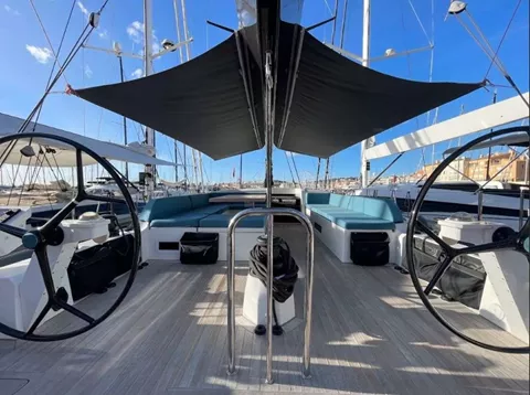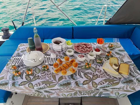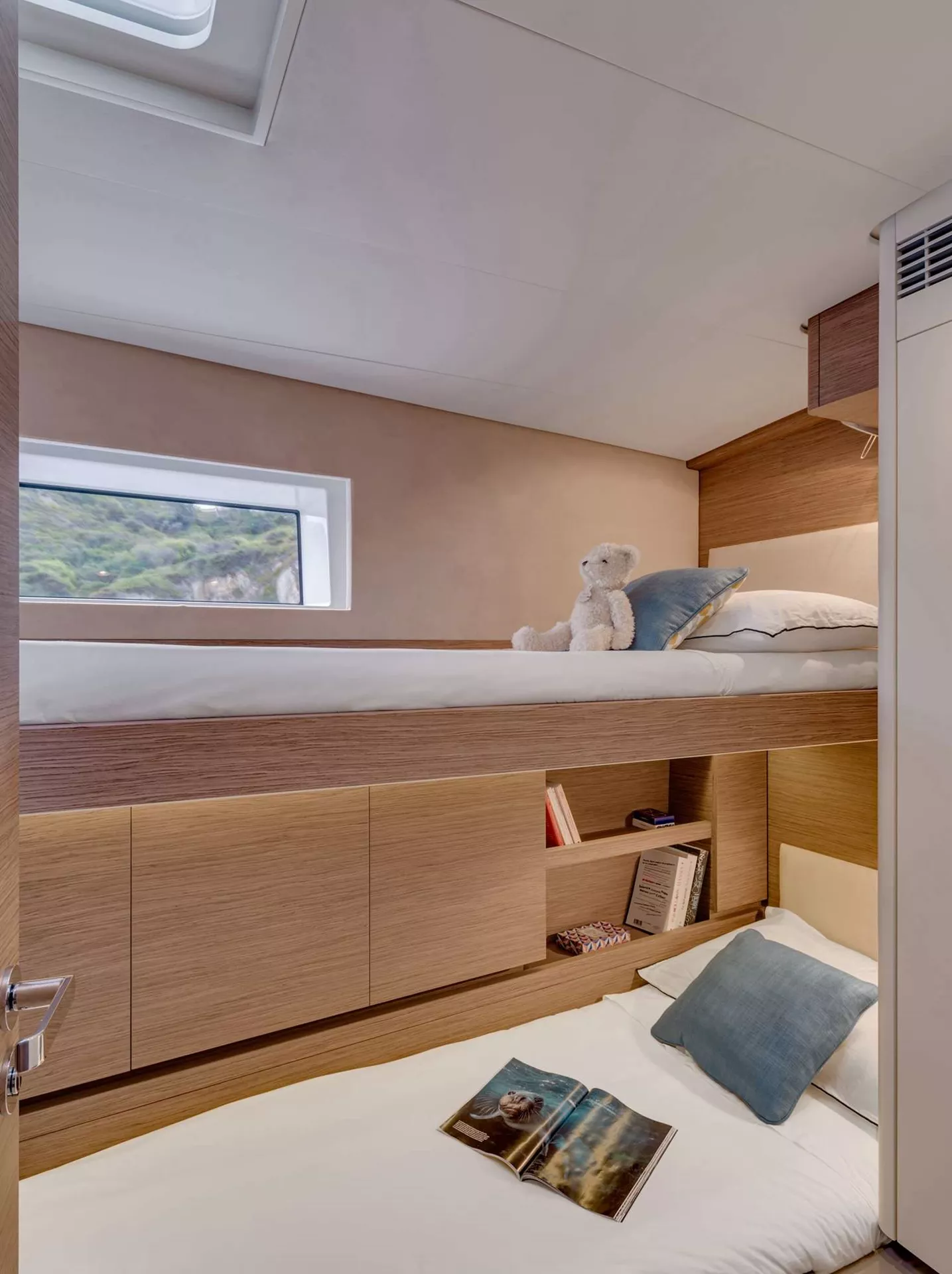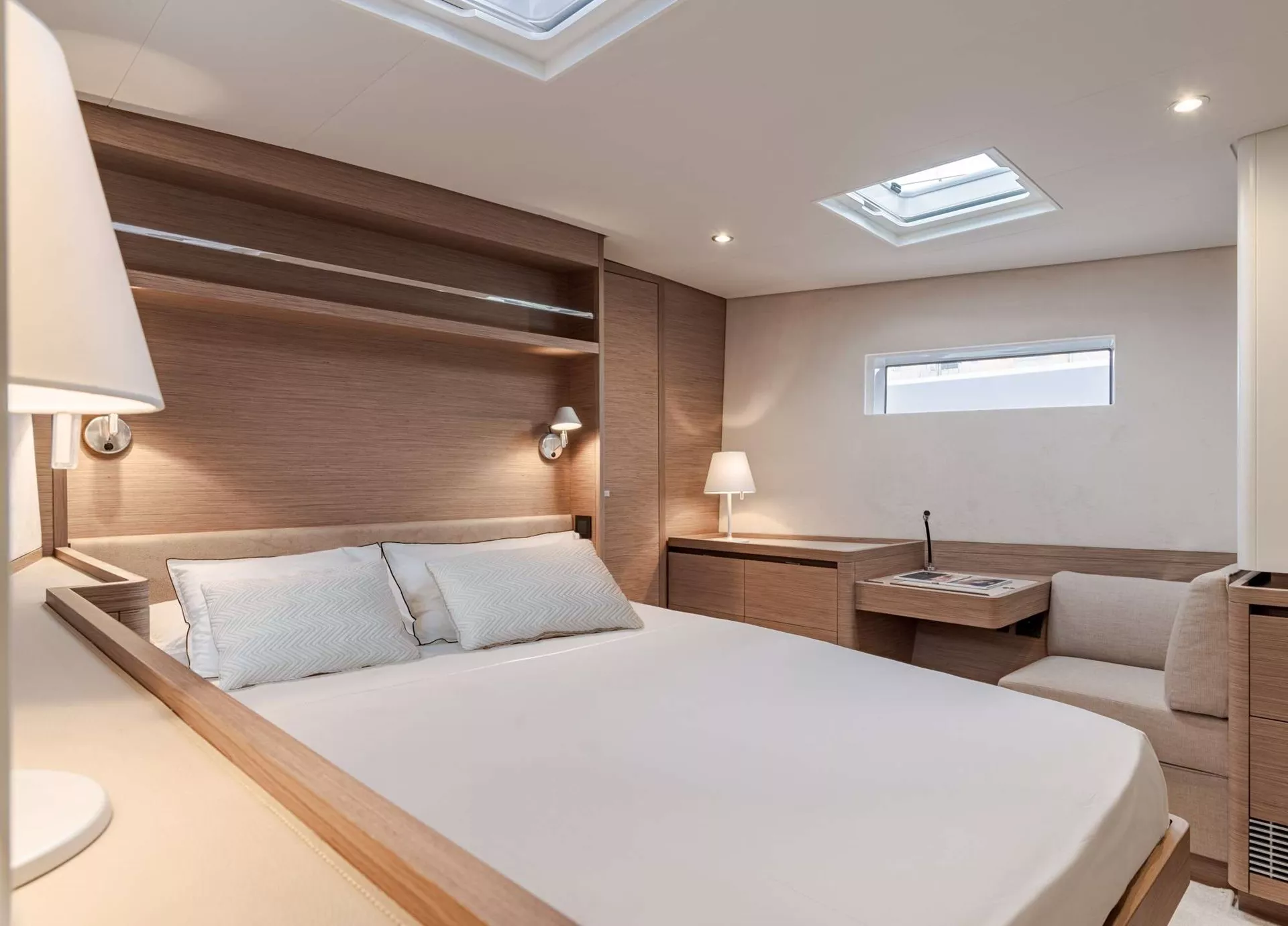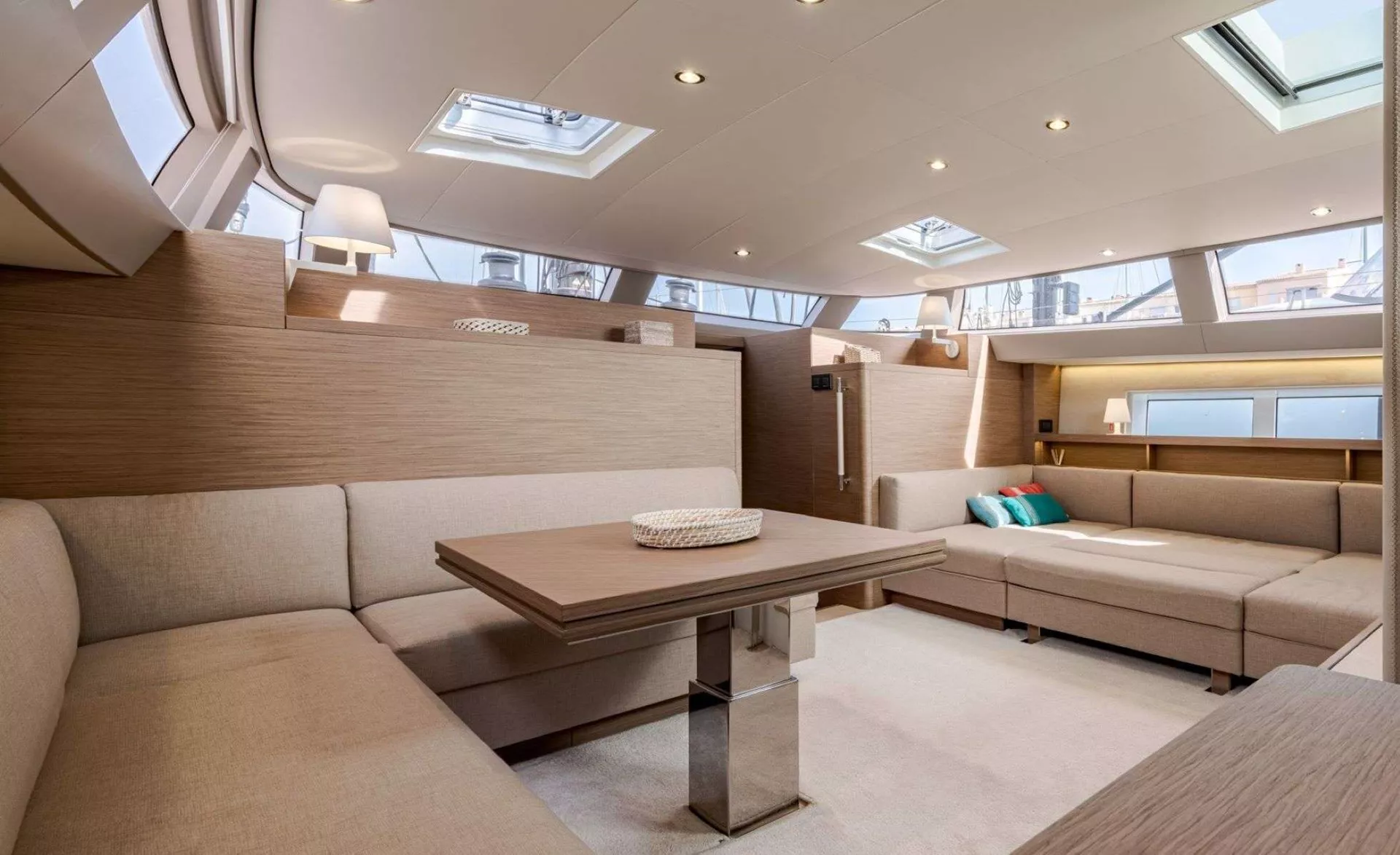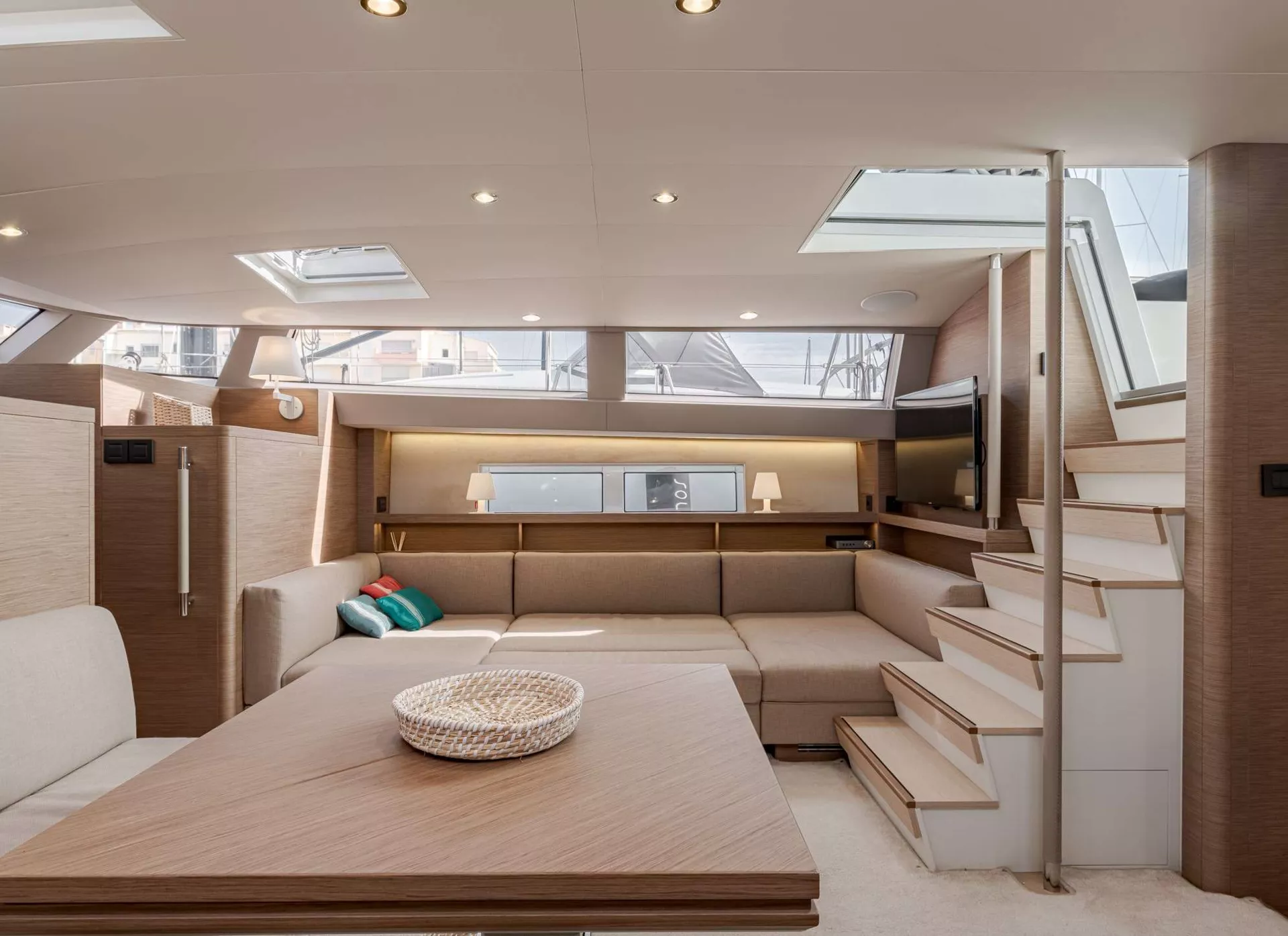 The saloon is spacious and bright, with panoramic front and side windows, large hull portholes and deck hatches for panoramic views. The sofa on the starboard side is adjustable, and the telescopic table on the port side can seat up to 8 guests.