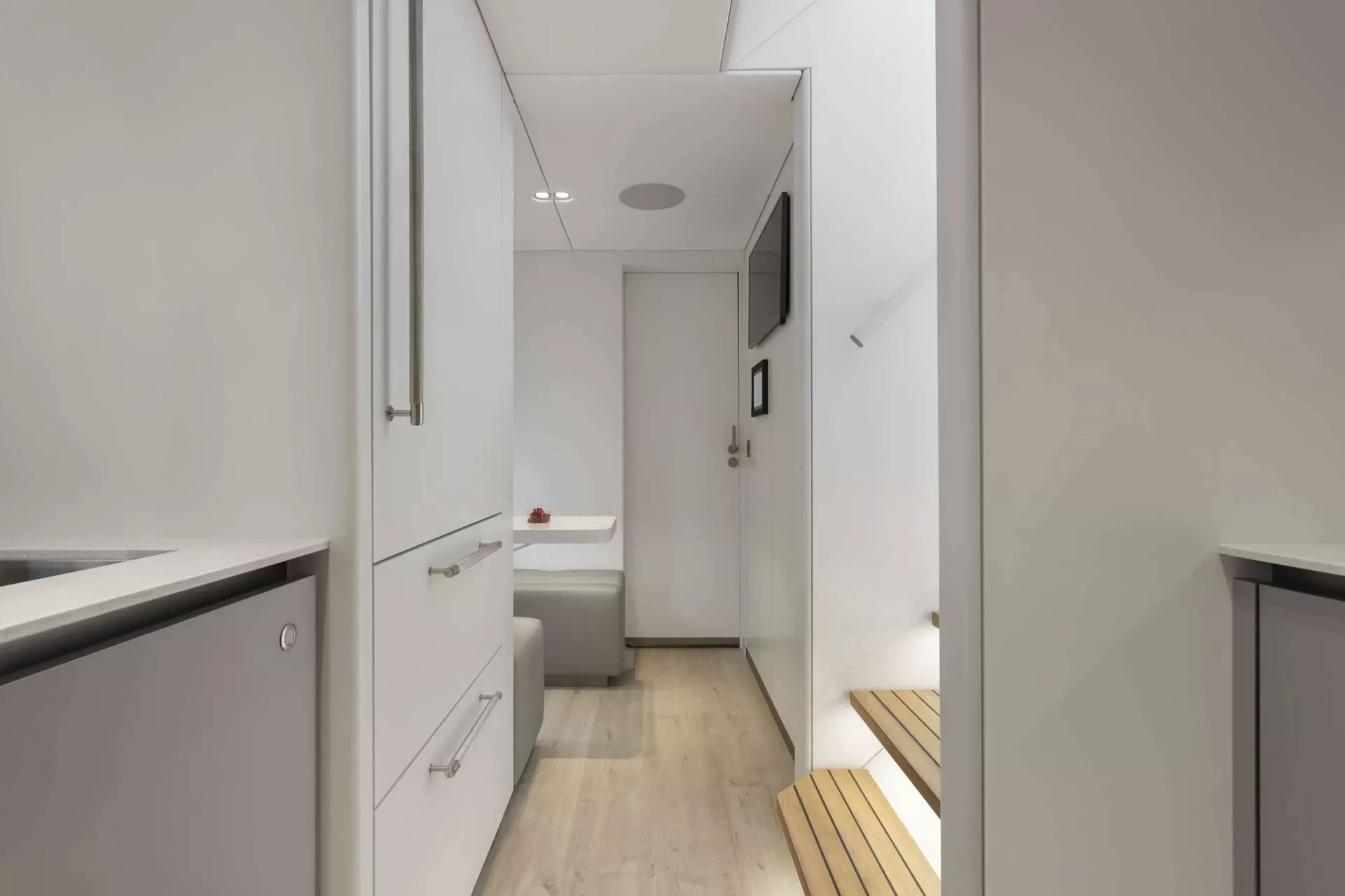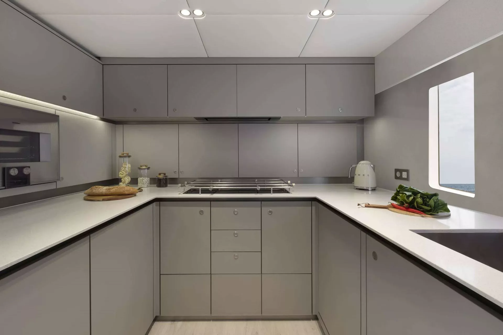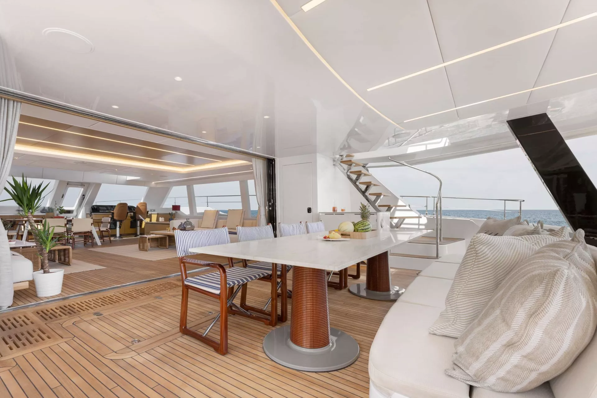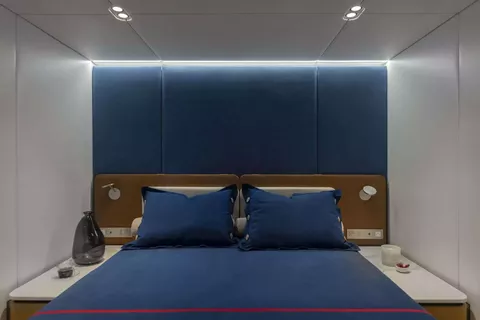 Designed with comfort at its core, PRONTO’s expansive interior provides a tranquil retreat bathed in natural light from panoramic windows framing sweeping ocean views. Accommodating up to eight guests across four luxurious en suite cabins, her décor harmoniously blends soft azure accents with bright, high-end fabrics and natural wood finishes—creating an inviting, contemporary ambiance.