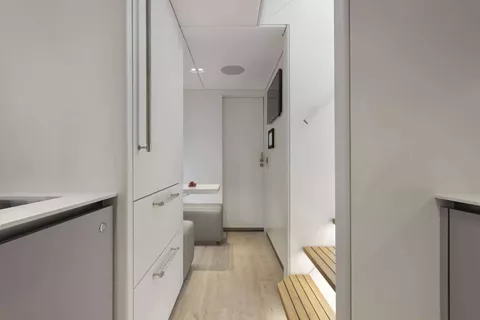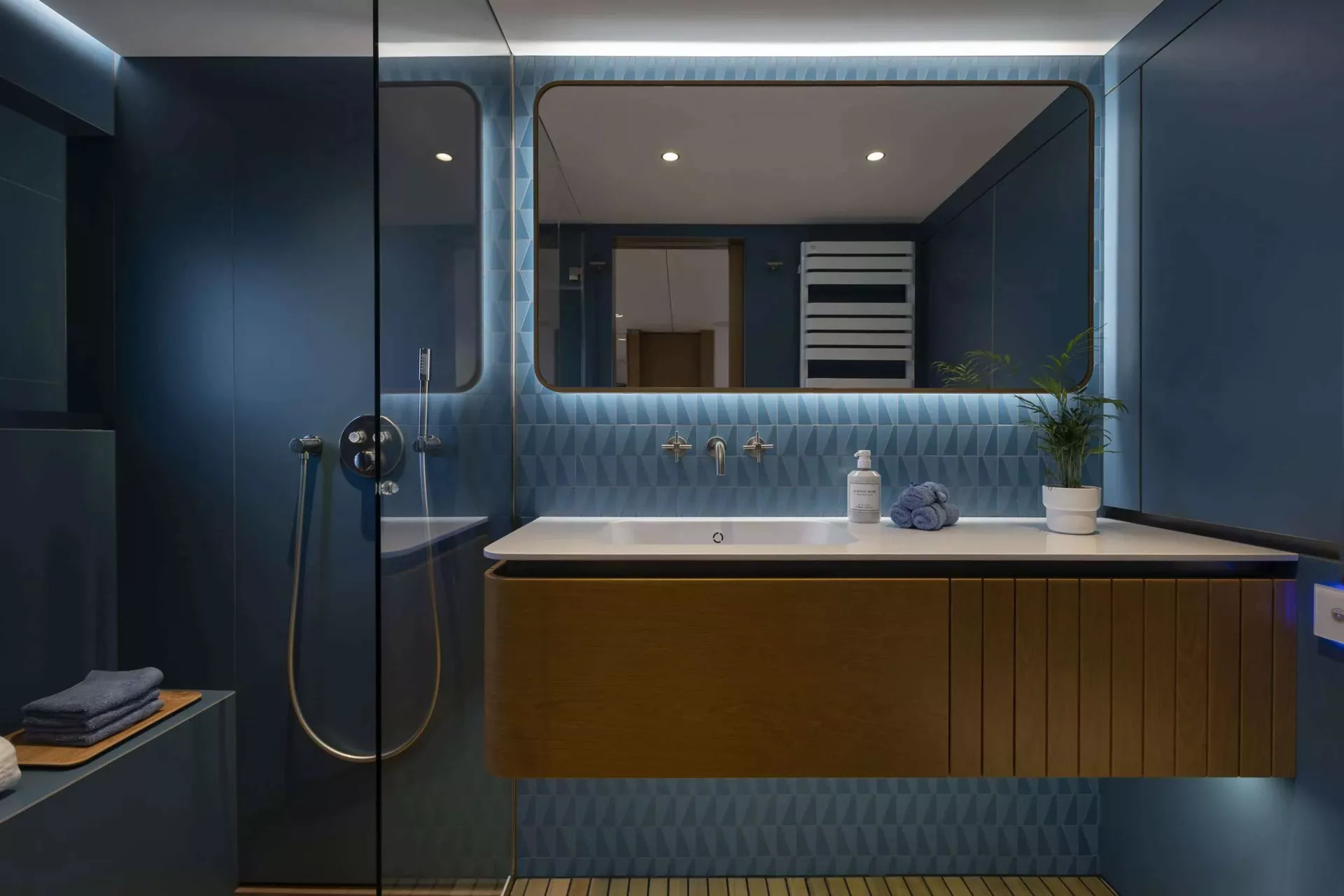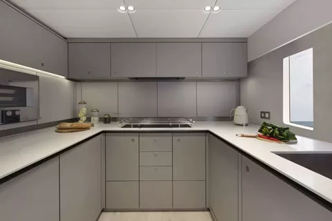 The four guest cabins are thoughtfully arranged, with a spacious master suite with king berth in the port hull, a double midships cabin, a twin forward cabin, and an aft cabin featuring a double bed plus a Pullman in the starboard hull. Each cabin offers the comfort and privacy of ensuite facilities, with the master distinguished by striking azure blue tiling and an expansive shower cubicle. The remaining suites continue the theme, accented with touches of azure blue and clean, contemporary lines.