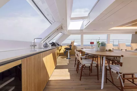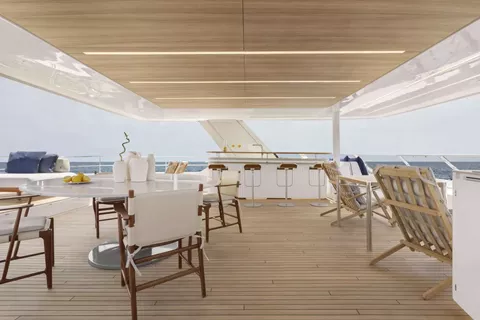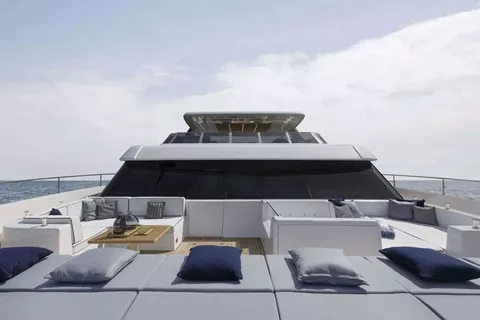On deck, PRONTO delivers exceptional spaces for relaxation and socializing. The full-beam foredeck features a jacuzzi, while the impressive flybridge hosts a round Italian dining table with spectacular 360-degree views. Aft, guests can enjoy alfresco dining or unwind on the large swim platform, which offers effortless access to the sea.