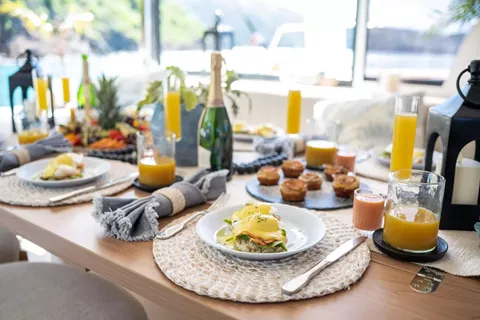 Adventure and relaxation go hand in hand with La Vie est Belle’s wide range of water toys and entertainment: rendezvous scuba diving, snorkeling gear, underwater scooters, wakeboard, stand-up paddleboard, a 10-foot floating dock, pool noodles, and fishing gear. For indoor fun, enjoy board and card games, a television in the salon, and a Fusion 3 Bluetooth-enabled sound system for your favorite tunes.