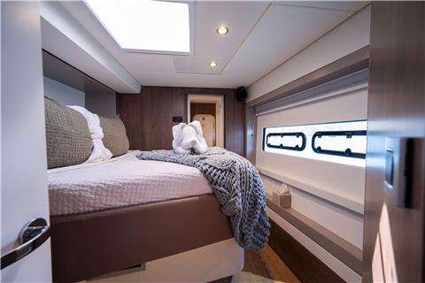 4 queen berth guest cabins each with a private en-suite electric head, stall shower and sink/vanity. The starboard aft cabin does not have a full shower, and has a wet head.