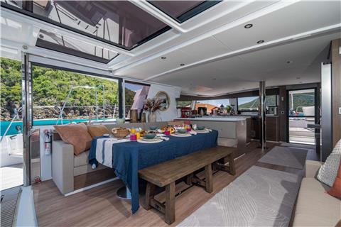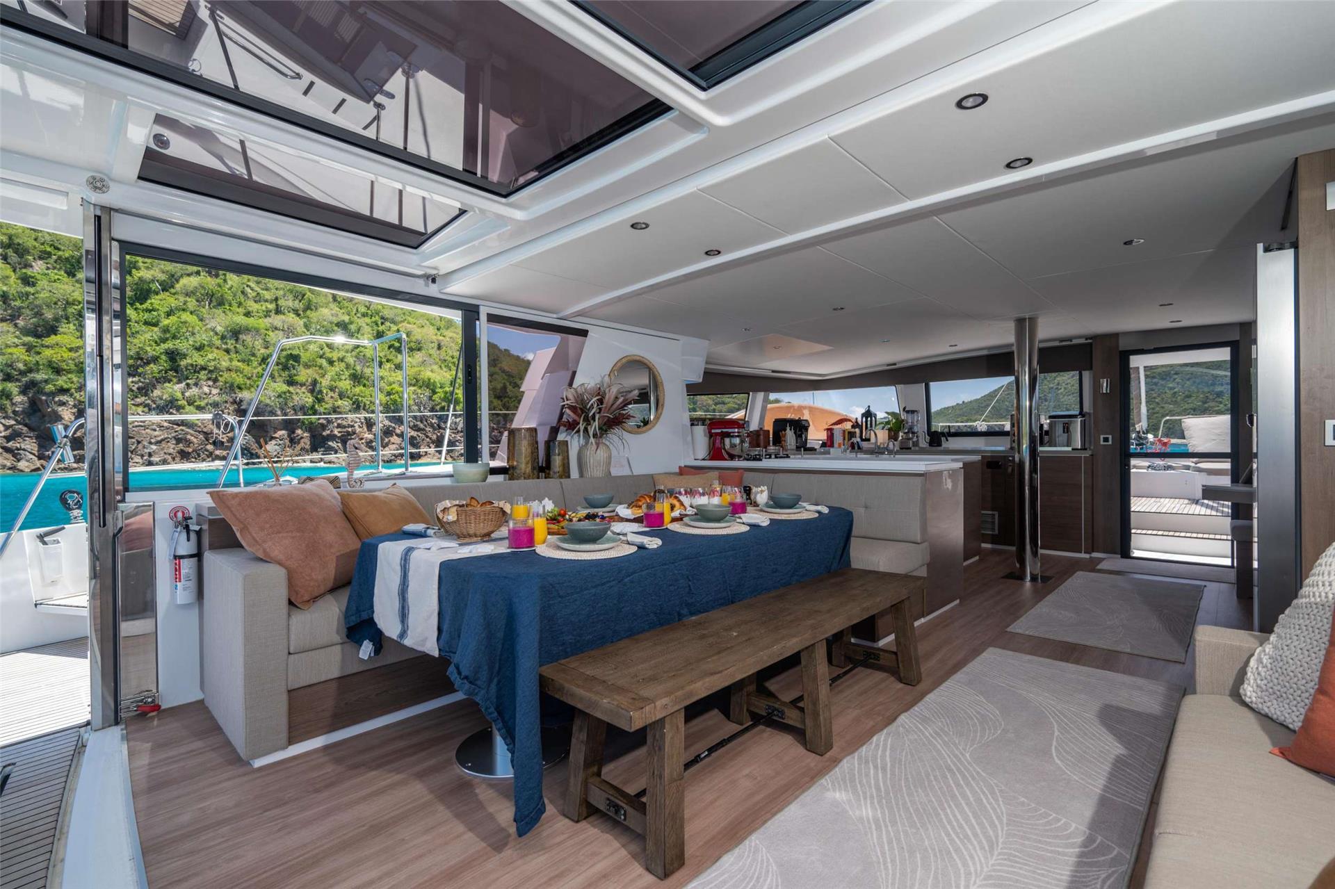 Main deck has a bright and airy main salon (fully air-conditioned) as the galley direct access to the forward cockpit lounge area.