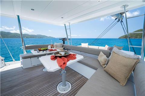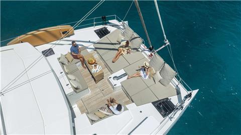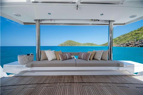 Top desk fly-bridge with lounging and seating with a 360 degree view.