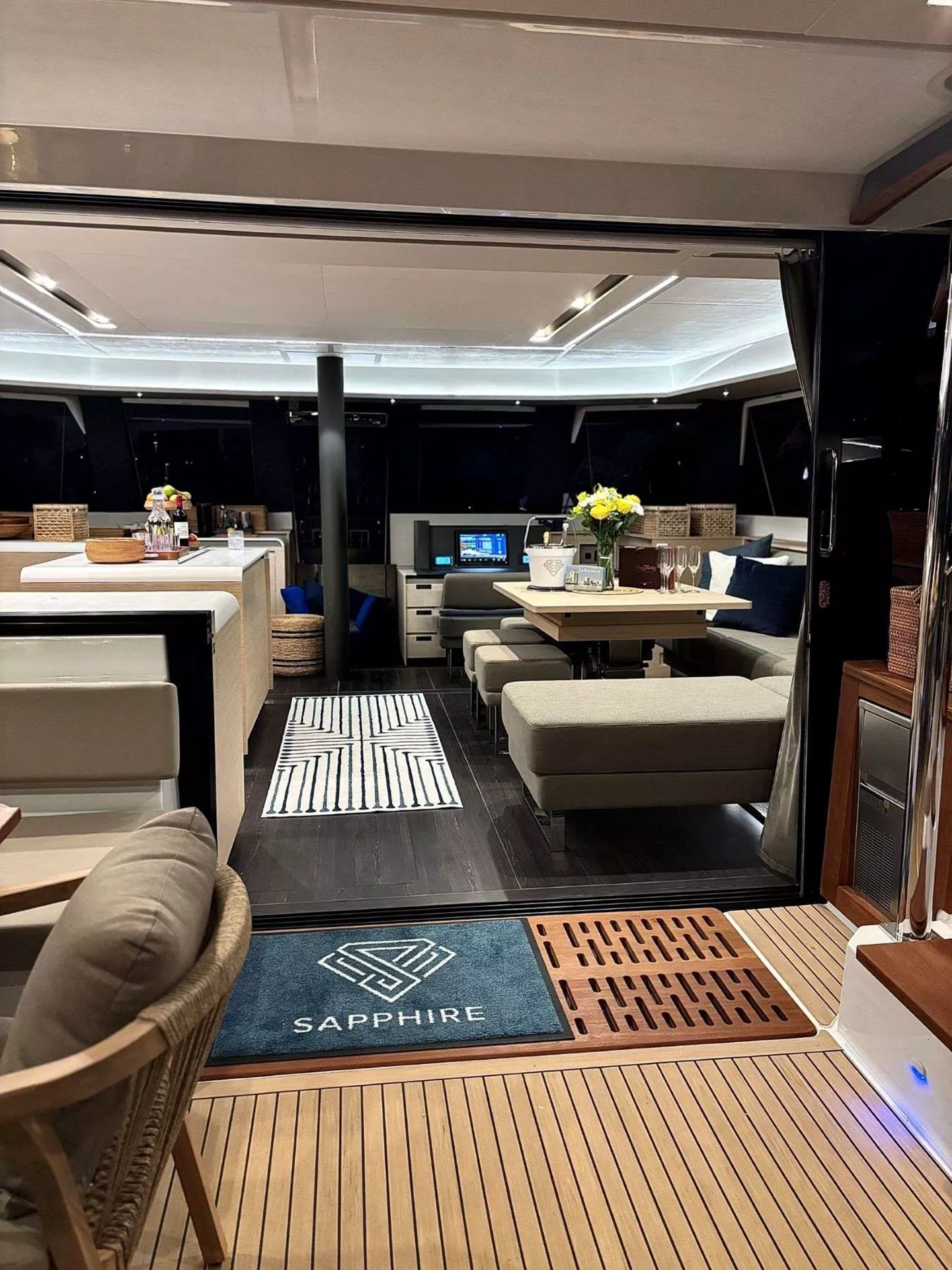 Sapphire offers luxurious accommodations for 8 charter guests in 3 spacious ensuite queen cabins and 1 sprawling king master cabin for those who desire more space. The starboard forepeak can be made available for children/teens at an additional cost – please inquire. She has a stunning blue Gennaker sail, teak flooring, hydraulic lift with wings, 70 HP Highfield 360 dingy, sugar scoop extensions with 2 swim ladders, jacuzzi, Caribbean made ecofriendly and reef safe toiletries, multiple bars stocked to guest preference, premium sound system, additional underwater lighting, Jura coffee/espresso machine, rendezvous scuba diving, snorkeling gear, underwater scooters, sea bob, e-foil, wakeboard, stand up paddle boards, 10 ft. floating dock, pool noodles, fishing gear, board and card games, television in the salon, movie theater, pizza oven and Sapphire branded giveaways.