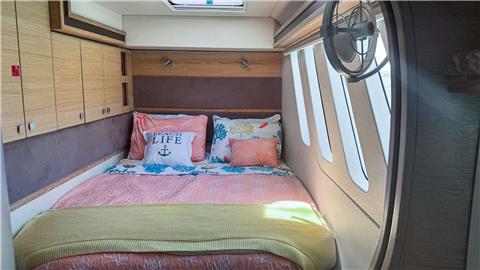 Outside, Stella Blue offers multiple areas to unwind. The generous cockpit includes a large dining table and plush lounge seating, while a smaller daybed nook beckons for cozy afternoon naps. Aft, guests can enjoy a full-width chaise lounge—an ideal spot for stargazing or soaking up sea views. Forward, twin trampolines and ample deck space invite sunbathing and quiet moments under sail.