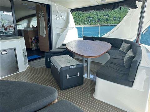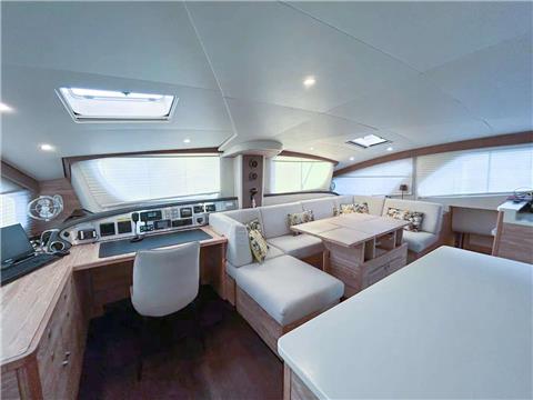 Her layout is the sought-after owner’s version, offering a spacious full-length suite on the starboard side, plus two luxurious guest cabins on the port side—each with its own ensuite featuring a separate shower, head, and vanity. The interior is bright and inviting, with a large island galley and an open-plan lounge/dining area perfect for sharing meals, playing games, or simply relaxing.