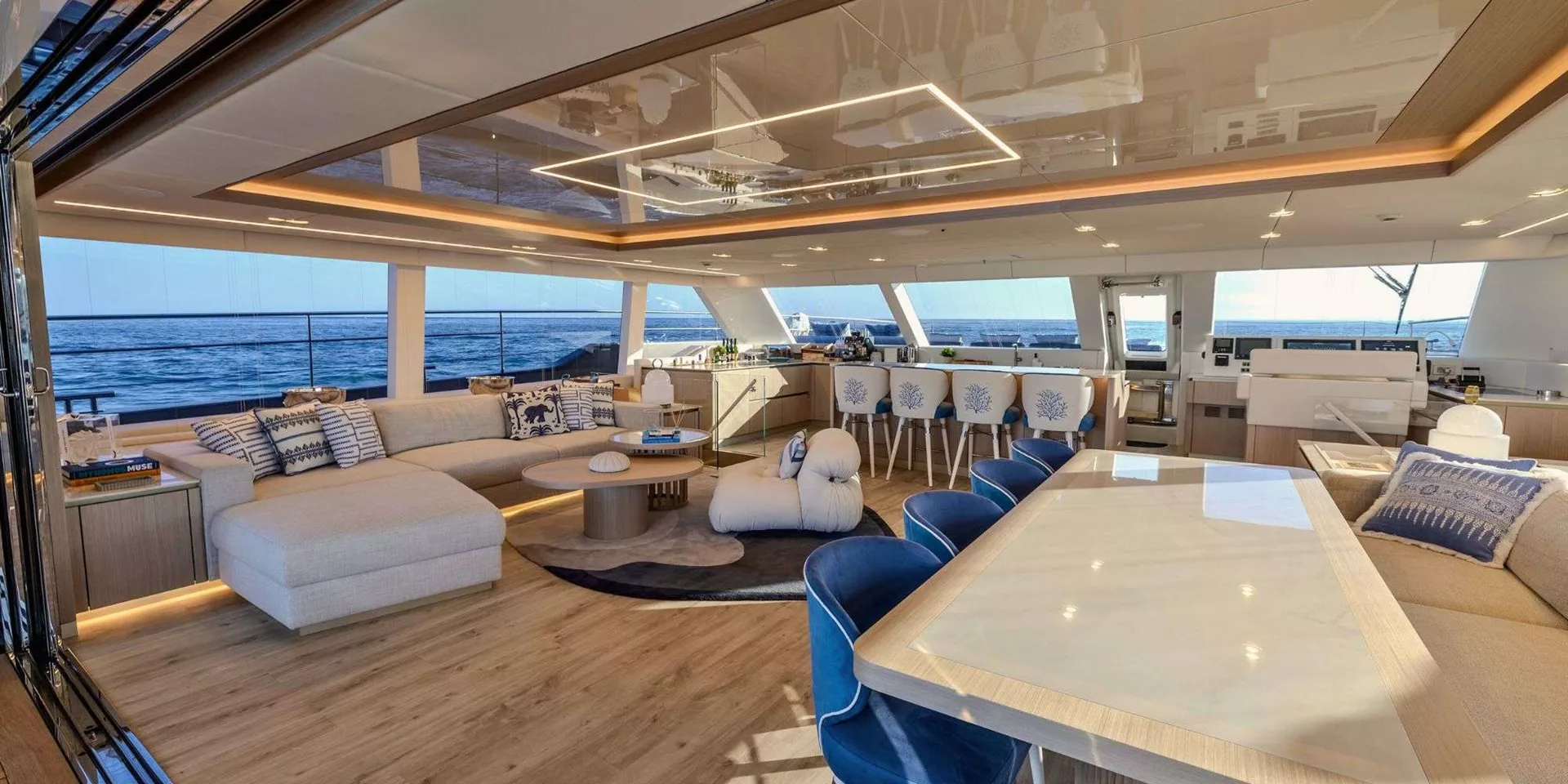Audio system in the salon, on the aft deck, fly bridge, and forward cockpit